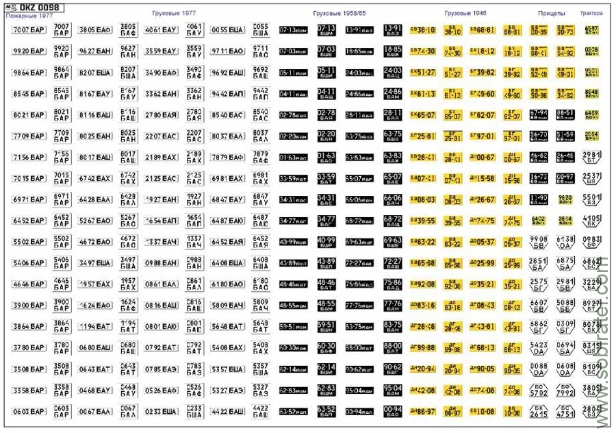 DKMB0098 НАБОР ДЕКАЛЕЙ НОМЕРНЫЕ ЗНАКИ СССР УФА - ПОЖАРНЫЕ, ГРУЗОВЫЕ, ТРАКТОРЫ И ПРИЦЕПЫ (200X140 ММ)