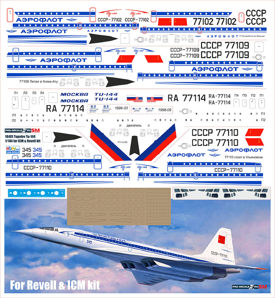 МЕГА ДЕКАЛЬ НА 4 САМОЛЁТА ТУ 144 (ICM, REVELL)