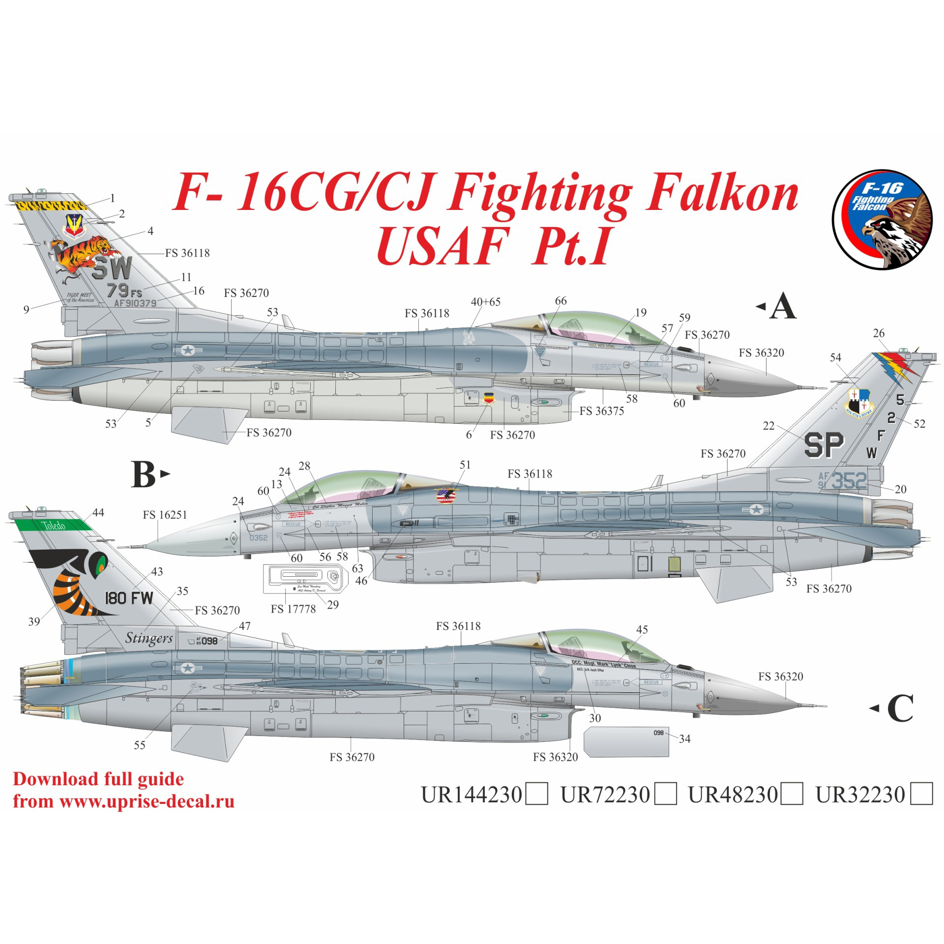 UR48230 UPRISE 1/48 ДЕКАЛЬ ДЛЯ F-16CG/CJ FIGHTING FALCON USAF PT.1, С ТЕХ. НАДПИСЯМИ, FFA (УДАЛЯЕМАЯ ЛАКОВАЯ ПОДЛОЖКА)