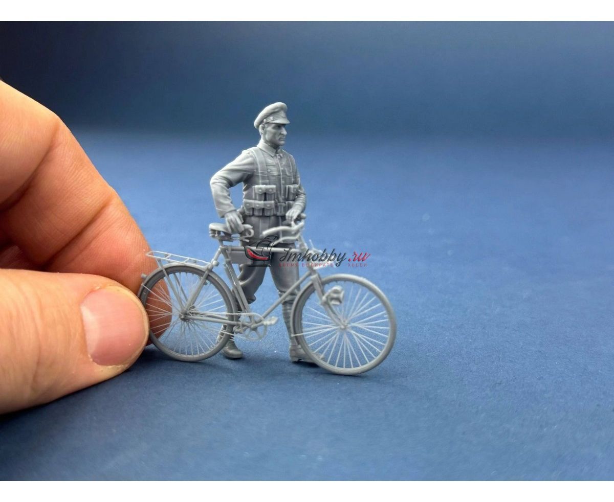 BRITISH ARMY CYCLIST WALKING WITH HIS BICYCLE