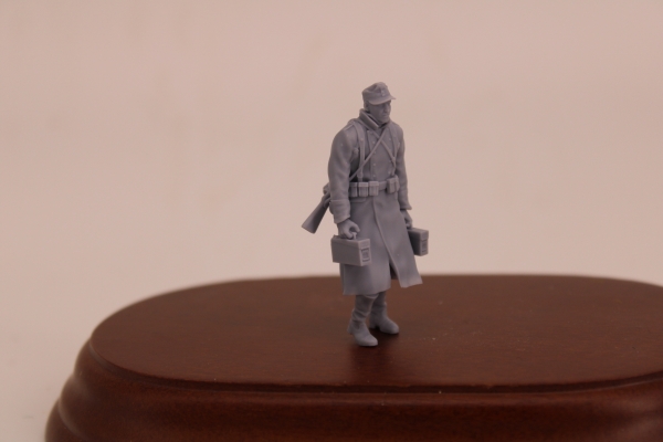 GERMAN SOLDIER WALKING IN GREYCOAT WITH FIELDCAP AND 2 MG AMMO BOXES