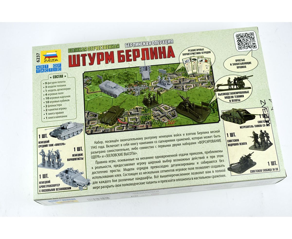 Третий из серии наборов, посвященных боям завершающего периода Великой Отечественной войны, который позволит вам разыграть сражения одного из этапов Берлинской операции 1945 г. Данный набор является полностью самостоятельным: вся кампания может быть разыграна исключительно содержимым коробки. Новые правила кампании позволят игрокам изменять свои армии за счет дополнительных наборов других родов войск. А книга сценариев этого и двух других наборов: Форсирование Одера и Зееловские высоты, связаны общим сюжетом и могут быть разыграны как одна большая кампания. Состав настольной игры:11 фигурок пехоты3 модели техники1 модель артиллерии4 игровых поля7 гексов местностинабор игровых карточек10 Игровых кубиков2 Фломастера2 Памятки игрокаКнига правилКнига кампании