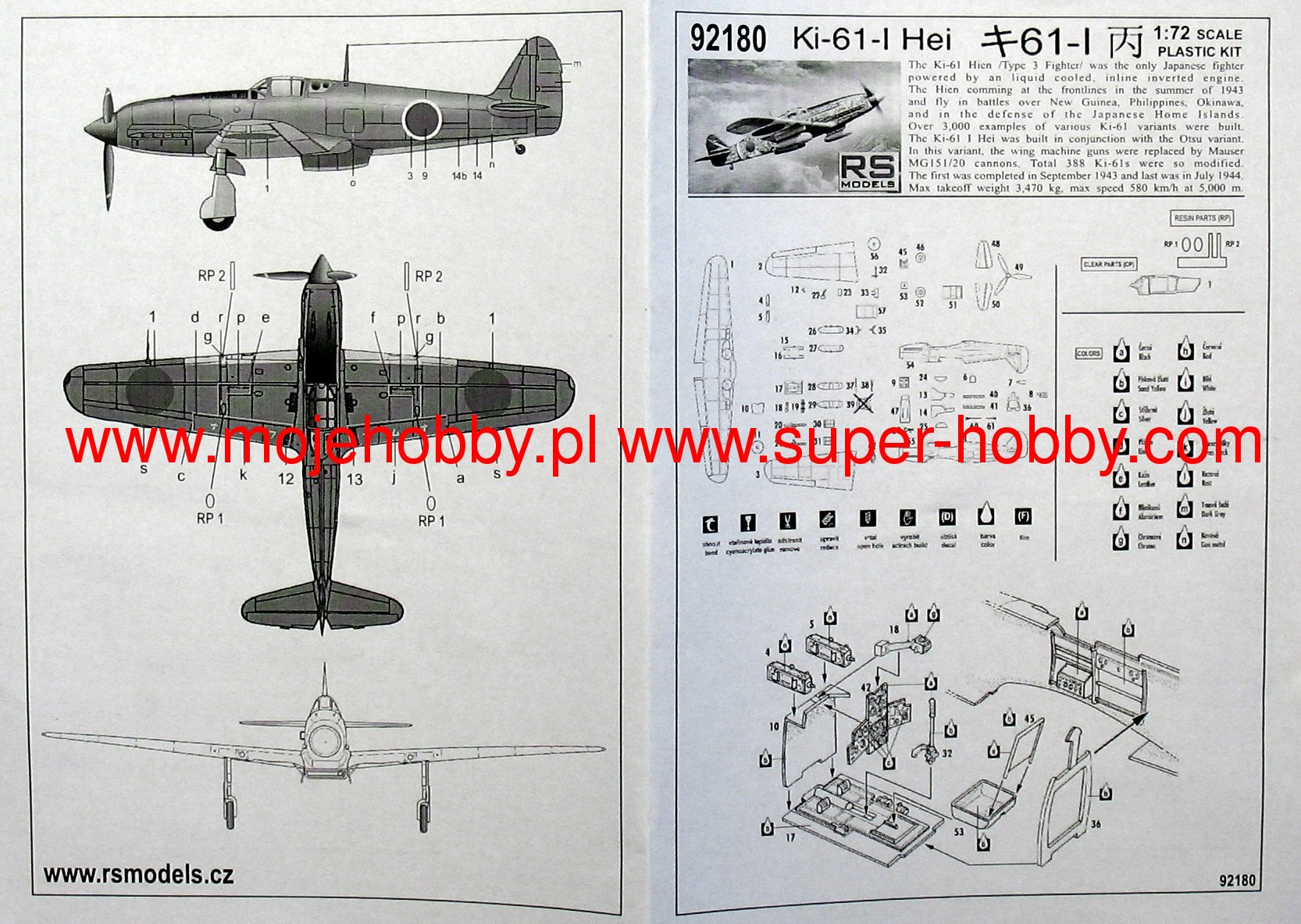 Kawasaki Ki-61 Hien (Japanese flying swallow) is a Japanese, single-engine, metal low wing fighter with a classic tail from the Second World War. The prototype's flight was nice in December 1941, and the first planes reached the line units in February 1943. The heart of the aircraft was the Kawasaki Ha-40 or Ha-140 engine, that is, a liquid-cooled German Daimler-Benz DB 601A built under license. The Ki-61 surprised the Allied forces during the fighting in New Guinea in June 1943, where it was taken as a copy of the German Messerschmitt Me-109, later suspected to be a copy of the Italian Macchi C202 or other Italian fighter. For this reason, he was given the nickname "Antonio" or "Tony". During the fights in 1943, Ki-61 fighters demonstrated their considerable advantage over American machines, such as the F-4 Wildcat. The Ki-61 later fought over the skies of New Britain and New Ireland, and in 1944 they were used in combat in the Philippines. Later they were used to defend the Japanese islands. Some of them have become kamikaze planes. The Ki-61 was undoubtedly a very good fighter, but its Achilles' heel was limited in series production due to problems with the engines. Technical data (version Ki-61-I): length: 8.94m, wingspan: 12m, height: 3.7m, maximum speed: 580km / h, rate of climb: 15.2m / s, maximum range: 580km, ceiling maximum 11,600m, armament: fixed - 2 12.7mm Ho-103 machine guns and 2 20mm Ho-5 cannons, suspended - up to 500 kg of bombs.