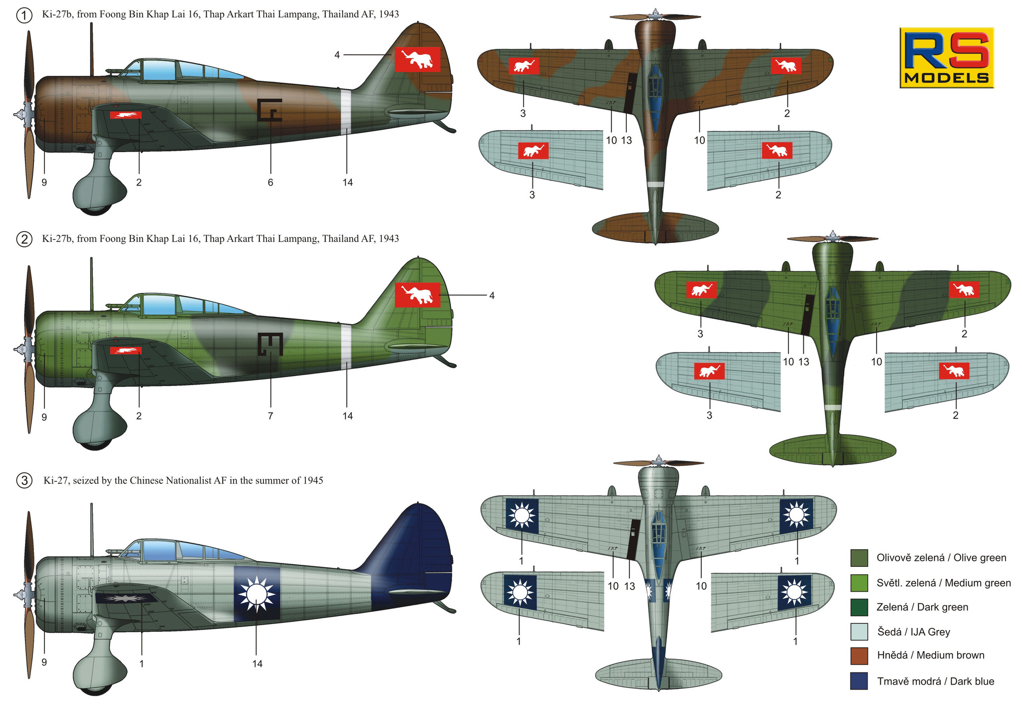 Nakajima Ki-27 японский одномоторный металлический низкоплан с неубирающимся шасси начала Второй мировой войны. Полет опытного образца состоялся 15 октября 1936 г., а поступление в строевые части состоялось в 1937 г. После ряда сравнений с другими тогдашними японскими машинами командование ВВС сухопутных войск приняло решение в 1937 году о серийном производстве машины, получившей обозначение Nakajima Type 97 Ki-27a. Эта версия была оснащена двигателем Nakajima Ha-1a мощностью 650 л.с., но версия с новым двигателем Nakajima Ha-1b мощностью 780 л.с., получившая обозначение Nakajima Type 97 Ki-27b, была запущена в производство очень быстро. Серийное производство обеих версий продолжалось с 1937 по 1942 год и привело к выпуску около 3400 экземпляров этого самолета. Nakajima Ki-27 был основным армейским истребителем, использовавшимся в боях с ВВС СССР на озере Часан и реке Халхин-Гол в Китае и в начале Второй мировой войны в Бирме и Малайе. С 1943 года машины переоборудовали в учебные Ки-79. Технические данные (версия Ки-27б): длина: 7,53 м, размах крыла: 11,31 м, высота: 3,28 м, максимальная скорость: 470 км/ч, скороподъемность: 15,3 м/с, максимальная дальность: 1100 км, максимальный потолок 12 250 м, Вооружение: стационарное 2 пулемета тип 89 калибра 7,7 мм, подвесное до 100 кг бомб.