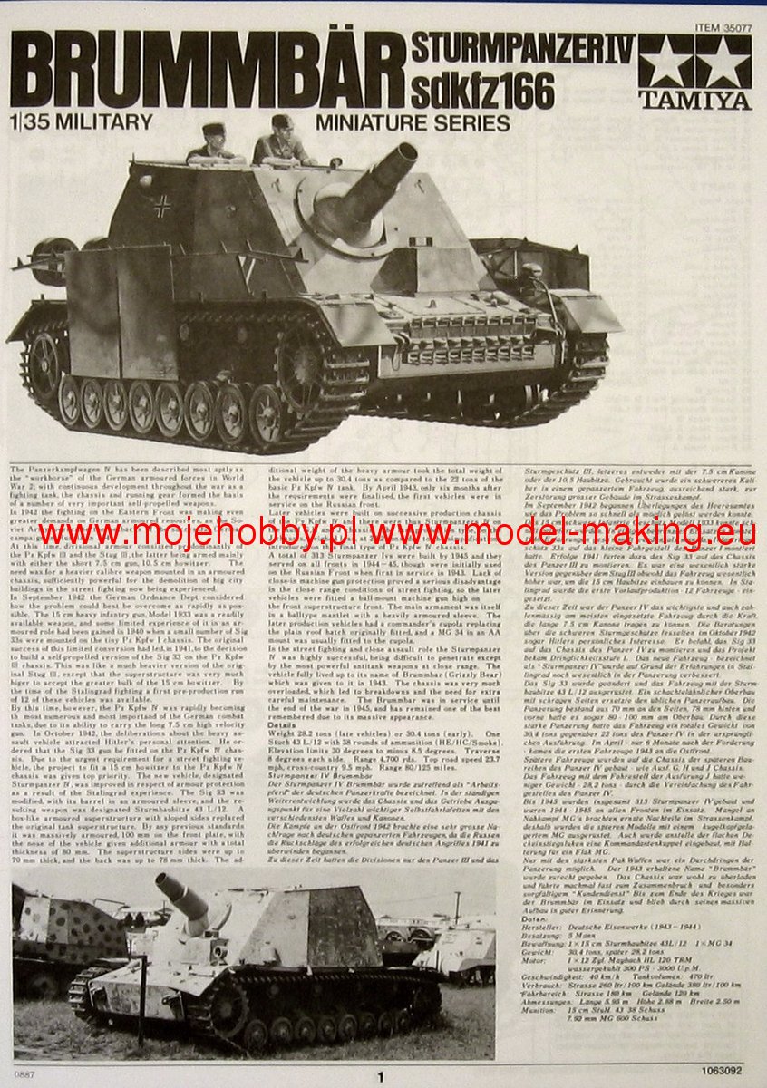 ОПИСАНИЕ ТОВАРА Сборная модель из пластика. Немецкая самоходная гаубица Sturmpanzer IV BRUMMBAR с 2-мя фигурами. Клей и краски в комплект не входят.
