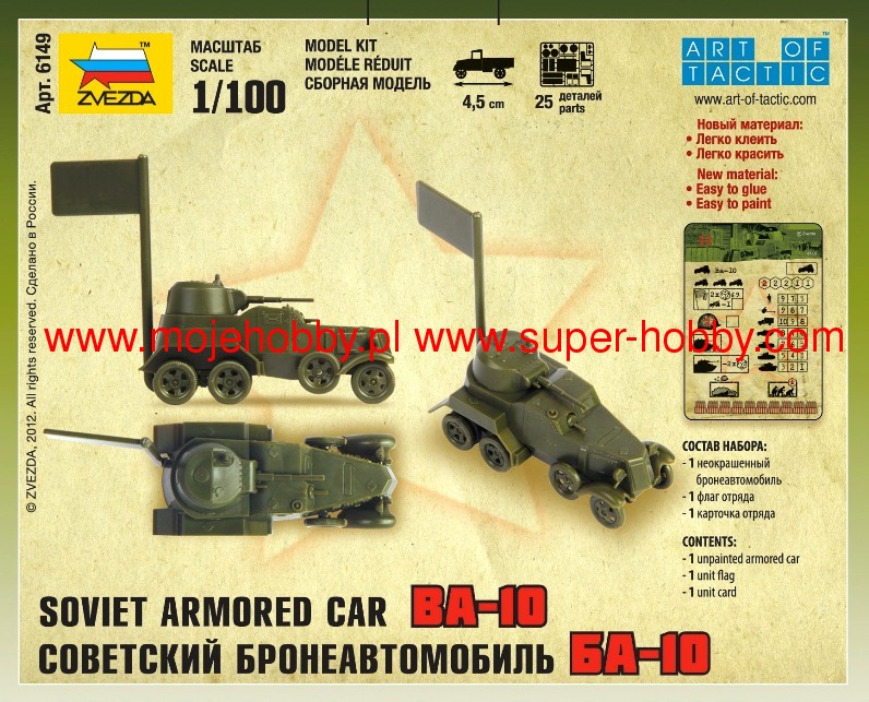 Сборная модель - Советский бронеавтомобиль БА-10. Историческая справка: Бронеавтомобили состояли на вооружении во многих странах мира. Они предназначались для разведки, разведки боем, рейдов по тылам противника. Не отставали от европейских стран и СССР. БА-10 является средним бронеавтомобилем. На вооружении пулемёт и 45мм пушка. Являлся грозным противником, превосходил лёгкие танки противника. Однако, слабая броня и свёртывание производства, в связи с эвакуацией на восток, поставили крест на перспективной линейки бронеавтомобилей БА. Использование бронеавтомобиля в Art of Tactic: В игре БА-10 по стоимости примерно равен лёгкому танку. По боевой мощи равен лёгким советским танкам. При этом он может вести разведку так как более мобилен. Из минусов всё те же болезни устаревших танков начала Войны слабая броня. Набор деталей из пластмассы для сборки одной модели неокрашенного бронеавтомобиля. Состав набора: 1 неокрашенный бронеавтомобиль 1 флаг отряда Сборка осуществляется без использования клея. Карточку с игровыми характеристиками отряда вы найдете на этой странице в разделе "СХЕМА СБОРКИ И ОКРАСКИ"