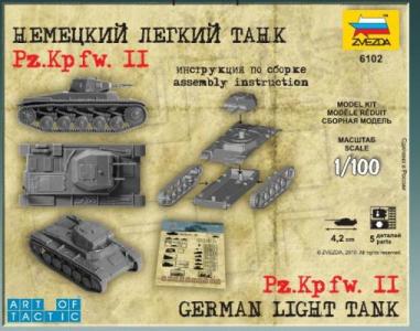 Сборная модель - Немецкий лёгкий танк Pz.Kp.fw II. Историческая справка: Серийно танк выпускался с 1934 по 1943 гг. Уже в польской кампании стало ясно, что он проигрывает своим аналогам, однако, к моменту нападения на Советский Союз в составе Вермахта было около тысячи таких машин. Множество их было потеряно уже в первые два месяца боёв. По некоторым данным 70 таких машин принимало участие в Курской Битве. Использование танка в Art of Tactic: Танк отлично подходит на роль танка поддержки пехоты. Относительно дешёвый и лучше защищённый, чем советские аналоги, в ближнем бою имеет меткость 3. Набор деталей из пластмассы для сборки одной модели неокрашенного танка. Состав набора: 1 неокрашенный танк 1 флаг отряда Карточку с игровыми характеристиками отряда вы найдете на этой странице в разделе "СХЕМА СБОРКИ И ОКРАСКИ" Инструкция на коробке! Сборка осуществляется без использования клея.