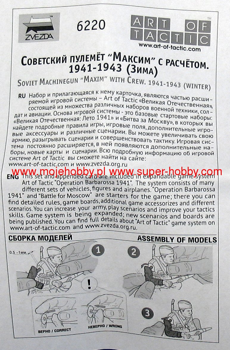 Сборные солдатики - Советский пулемёт "Максим" с расчётом 1941-1943 (зима). Историческая справка: Суровые морозы никогда не были в новинку жителям СССР. Зимой тепло одевались все, включая и армию. Пулемётные расчёты советской армии стойко выдерживали холода и снегопады, не прекращая уничтожать наступавших противников. Тёплая шинель, отлично справлялась со своей задачей, позволяя долгое время лежать в снегу. Пулемёт Максим ставили на лыжи или санки, таким образом он легко перемещался за наступающей пехотой. Использование мини-набора в Art of Tactic: В игре пулемётный расчёт станкового пулемёта полностью копирует свой прототип. Отлично разит наступающую пехоту, очень мобилен, а на возвышенность делается крепким орешком. Минусы, как и у всех пехотных отрядов в игре, есть и у Максима: уязвимость на открой местности, уязвимость от танковых пушек и незащищённость от авиации врага. При всём этом, пулемёт является опорой любой обороны противопехотной направленности. Набор деталей для сборки 4-х неокрашенных фигур и 2 пулемета. Состав набора: 4 неокрашенные фигуры 2 пулемета 1 отрядная подставка с флагом 1 инструкция по сборке Сборка осуществляется без использования клея.