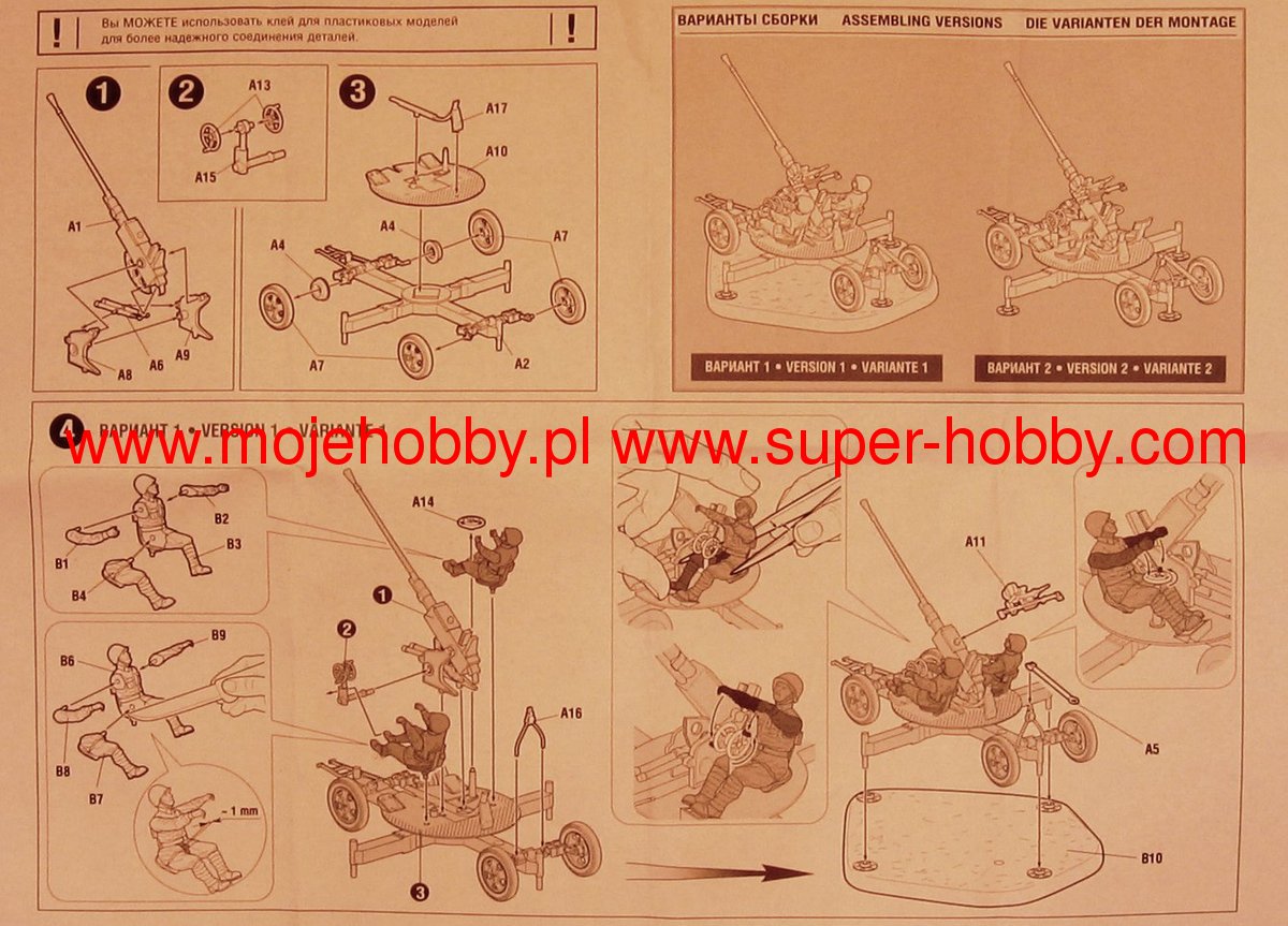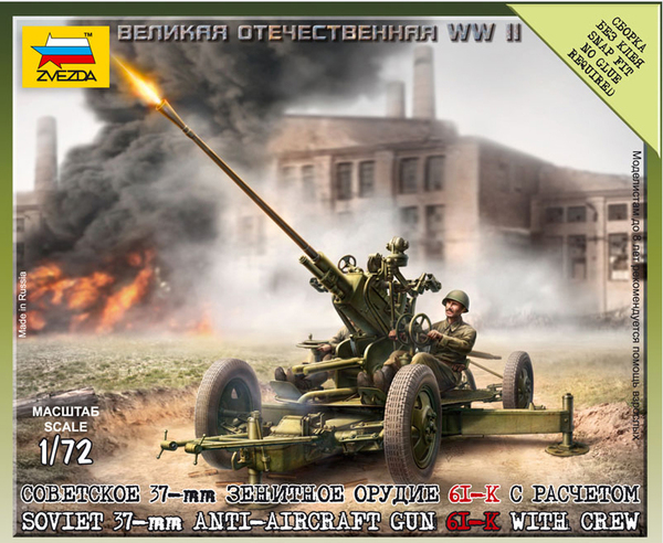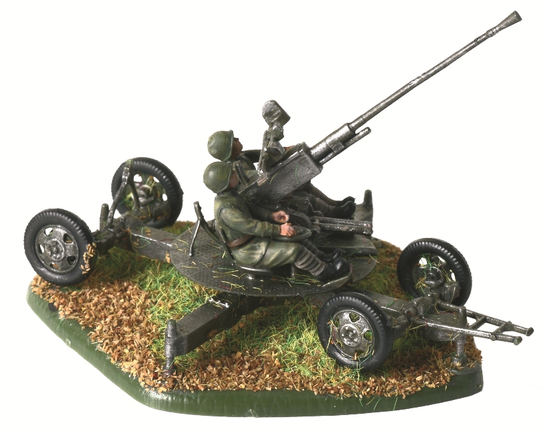 Сборная модель - Советское 37-мм орудие 61-К с расчётом. Историческая справка: Зенитные орудия начали создаваться ещё в Первую Мировую Войну, но подлинный их рассвет пришёлся на межвоенный период. В СССР, как и в других странах, в середине 30х годов преобладала идея универсализма, т.е. орудие должно одновременно хорошо бороться, как с танками, так и с самолётами вероятного противника. Минусы этой теории были хорошо видны на многих моделях пушек середины 30х, поэтому в СССР данная теория была разгромлена. Но при этом зенитные орудия сохраняли низкий угол наклона ствола. Как показала практика Войны, зенитные орудия такими и должны быть. Части ПВО отважно вступали в бой с немецкими танками. Так, под Москвой, окончательно стало ясно, что зенитные орудия намного эффективнее в стрельбе по танкам, нежели по самолётам. На курской дуге многие ПТОПы (противотанковый опорный пункт) были оснащены зенитными орудиями, у которых были сняты приборы для стрельбы по самолётам, им вести огонь по воздуху категорически запрещалось. Несмотря на всё вышесказанное, зенитные орудия Красной армии показали высокую эффективность и по прямому своему усмотрению. Это они вместе с истребителями помешали превратить в руины Москву и Ленинград, тыловые города, это они защищали с воздуха эвакуируемые предприятия и поезда с беженцами. Использование зенитки в Art of Tactic: В игре 61-К универсальное орудие. Цена относительно высока, однако орудие отлично справляется как с танками, так с авиацией противника. Из минусов стоит отметить отсутствие мобильности и уязвимость на открытой местности. Набор деталей для сборки 2-х неокрашенных фигур и 1 зенитного орудия. Состав набора: 2 неокрашенные фигуры 2 зенитных орудия отрядная подставка с флагом инструкция по сборке Сборка осуществляется без использования клея.