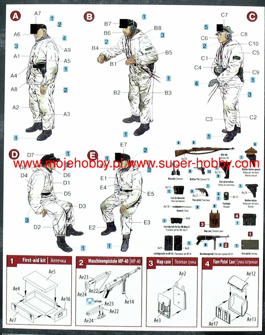 Kit contains 80 parts for assembling models of 5 figures and weapon.