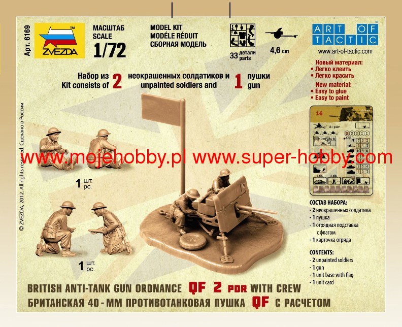 Сборные солдатики - Британская 40-мм противотанковая пушка QF с расчетом. Историческая справка: Орудие разрабатывалось в начале 30х годов, и к началу Войны сильно устарела. По опыту боёв во Франции, было решено поменять двухфунтовку, на новую мощную пушку. Однако, простота в изготовлении и лёгкая обучаемость на неё экипажа, позволили простоять на вооружении британской армии до начала лета 1942 года. В итоге, в Африке, англичане испытывали сложности в борьбе с танками противника. Использование пушки в Art of Tactic: В игре это единственное пехотное орудие британской армии. Против пехоты практически бесполезна, но против танков незаменима. Стоит отметить, что она может вести огонь даже по тяжёлым танкам противника. Набор деталей для сборки 2 неокрашенных фигур и одной пушки. Состав набора: 2 неокрашенных фигуры 1 пушка 1 отрядная подставка с флагом инструкция по сборке Карточку с игровыми характеристиками отряда вы найдете на этой странице в разделе "СХЕМА СБОРКИ И ОКРАСКИ" Сборка осуществляется без использования клея.