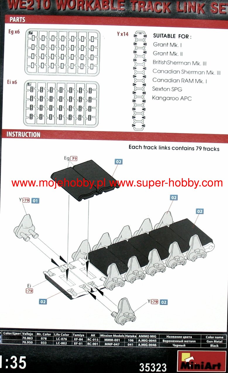 Set of workable track link set WE210 Suitable for : Grant Mk. I Grant Mk. II BritishSherman Mk. III Canadian Sherman Mk. III Canadian RAM Mk. I Sexton SPG Kangaroo APC