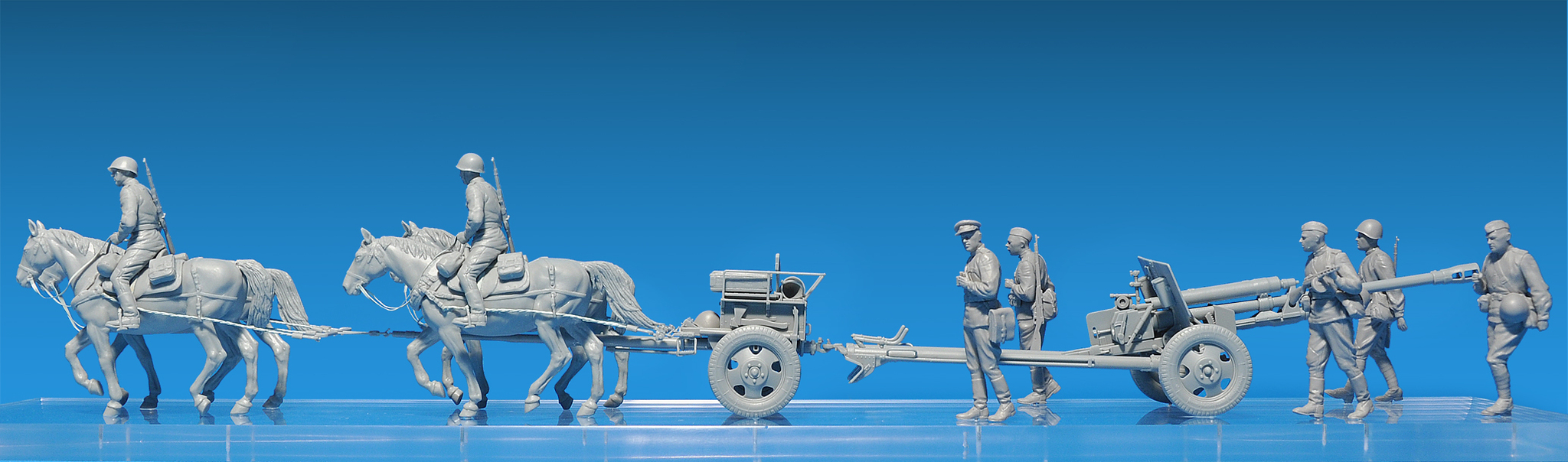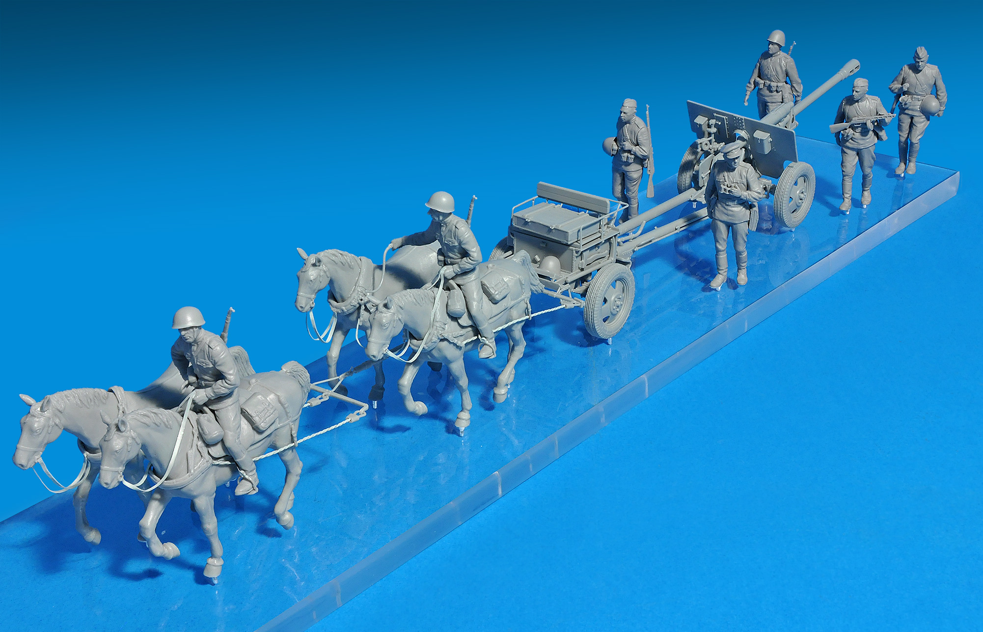 Набор содержит модели лошадей, артиллерийского передка, пушки и семи неокрашенных фигур.