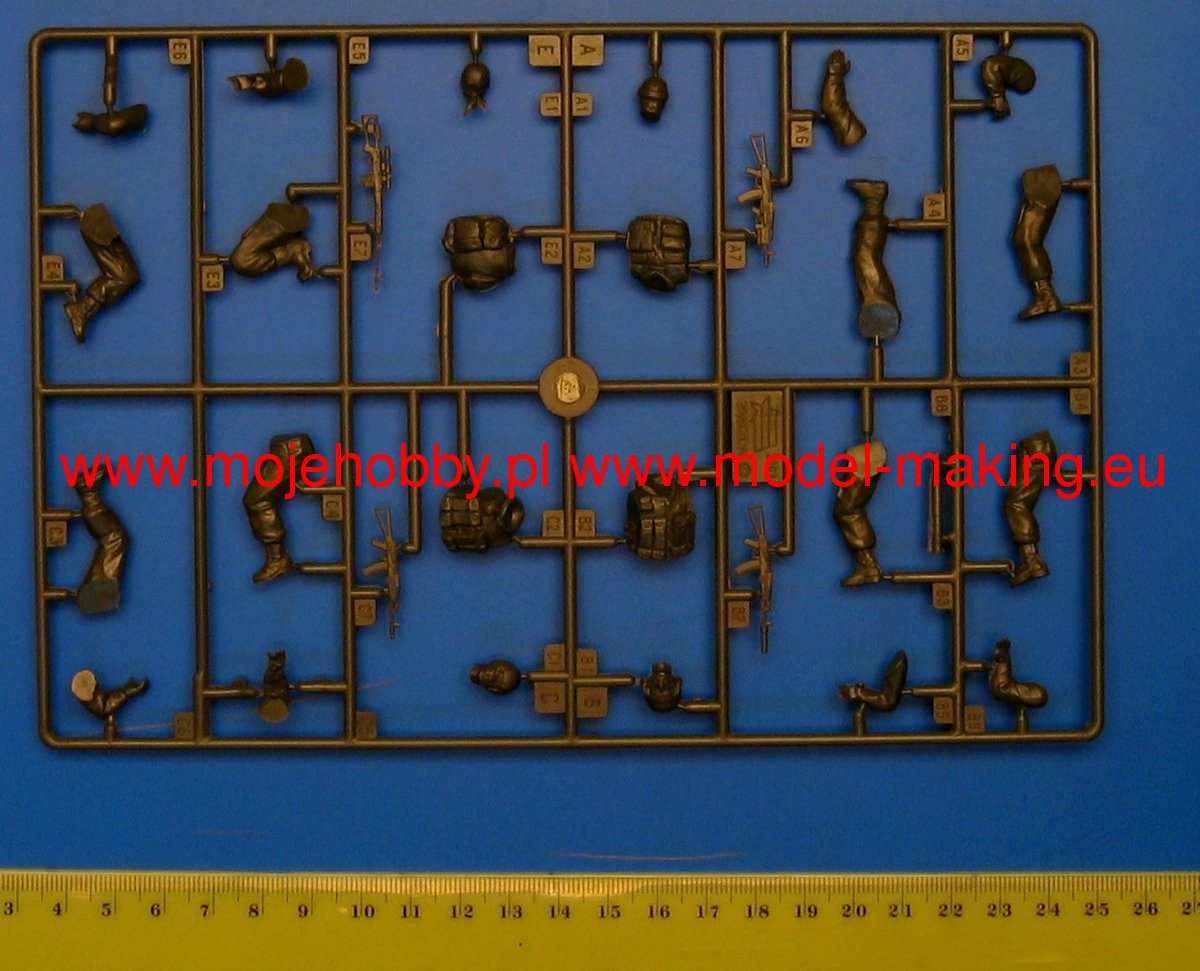 Сборные солдатики - Российский спецназ (набор № 1). Набор состоит из 4 фигур бойцов подразделения специального назначения Российской Федерации. Группа вооружена автоматами Калашникова различных модификаций и снайперской винтовкой системы Драгунова. Набор деталей из пластмассы для сборки 4-х фигур. Солдатики собираются при помощи специального клея, выпускаемого предприятием Звезда. Состав набора: инструкция по сборке отливки