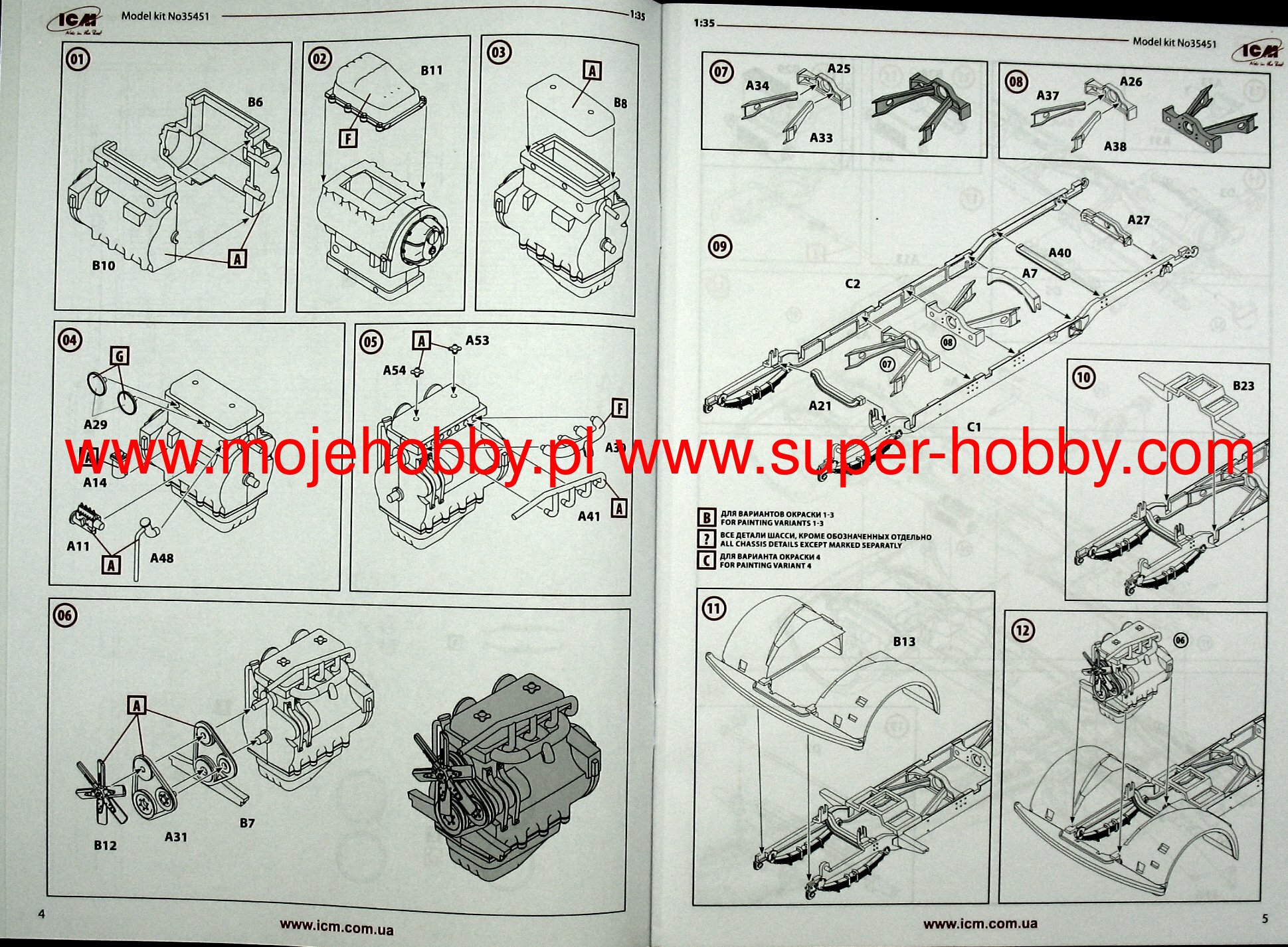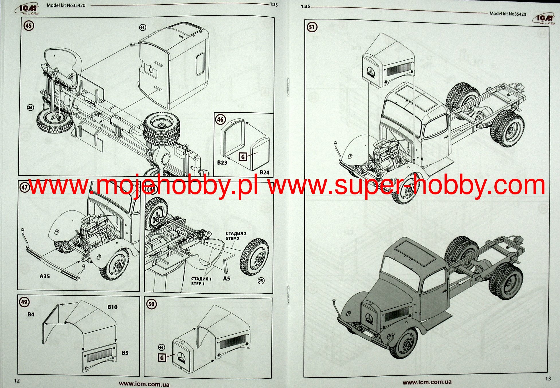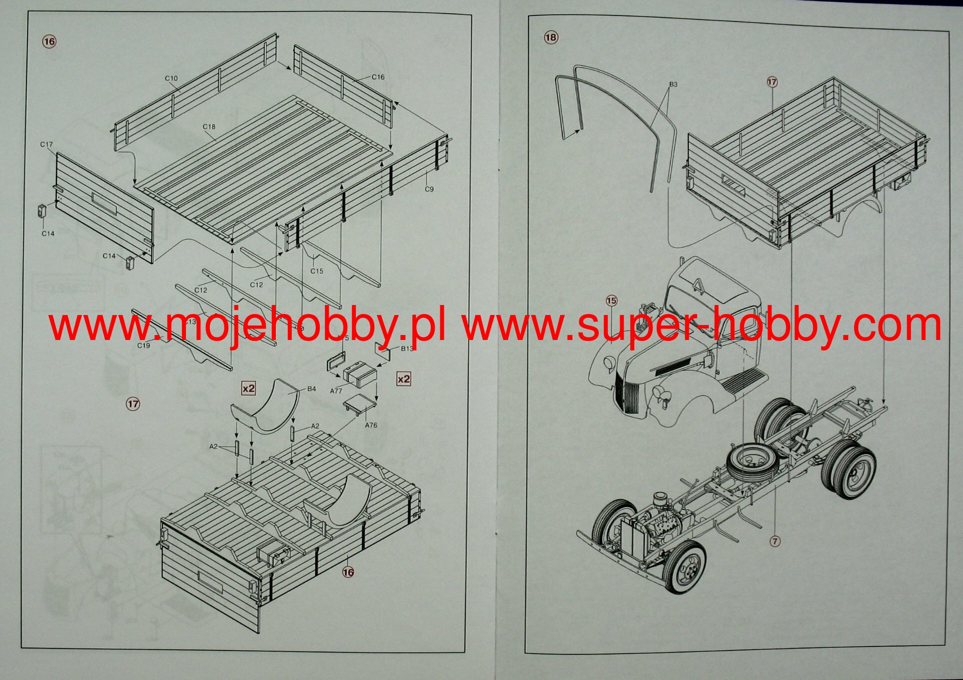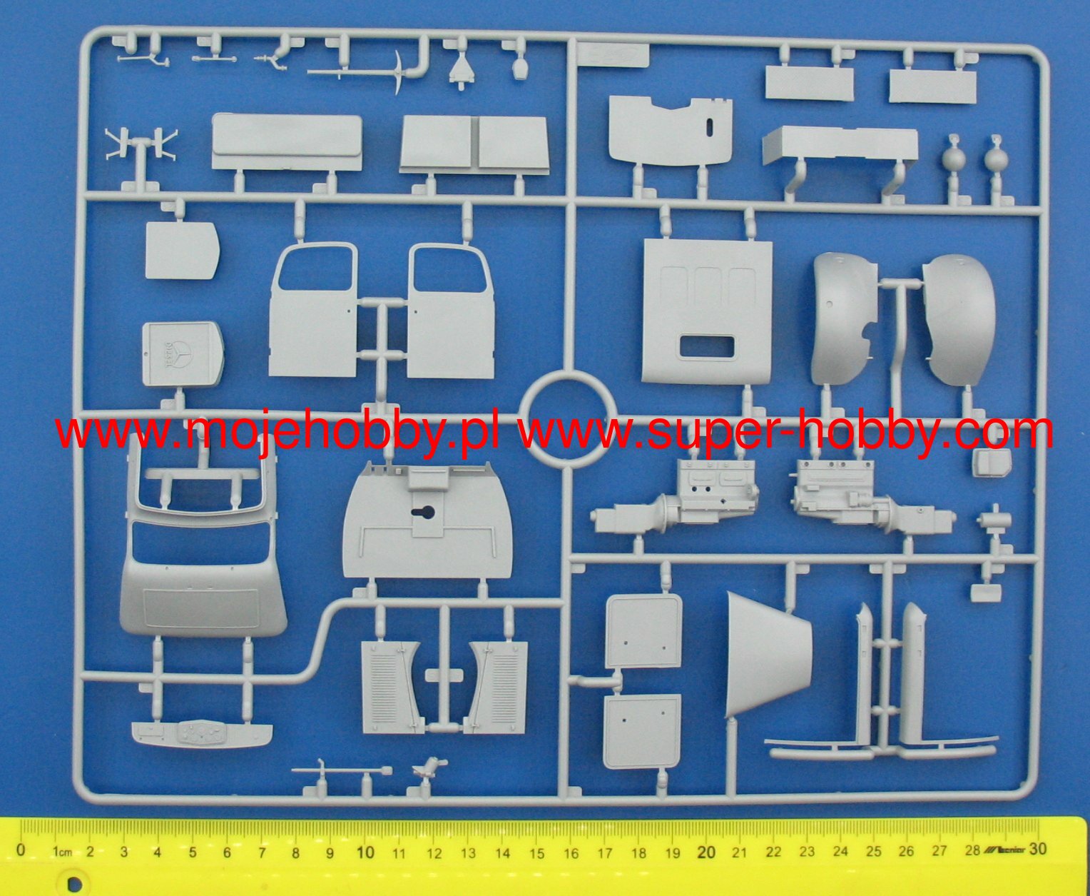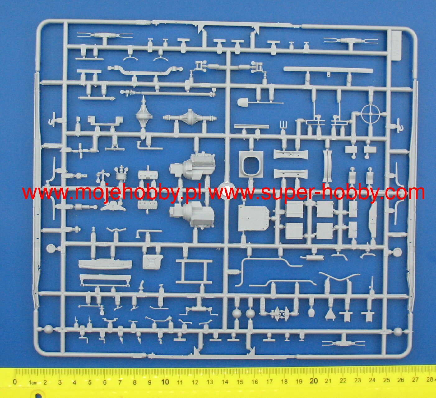 В комплект входят 182 детали для сборки V3000S, 174 детали для сборки KHD S3000 и 176 деталей для сборки немецких моделей грузовиков L3000S времен Второй мировой войны. Масштаб: 1/35 Количество деталей: 506 шт. Сложность: Средне Клей и краски в комплект не входят