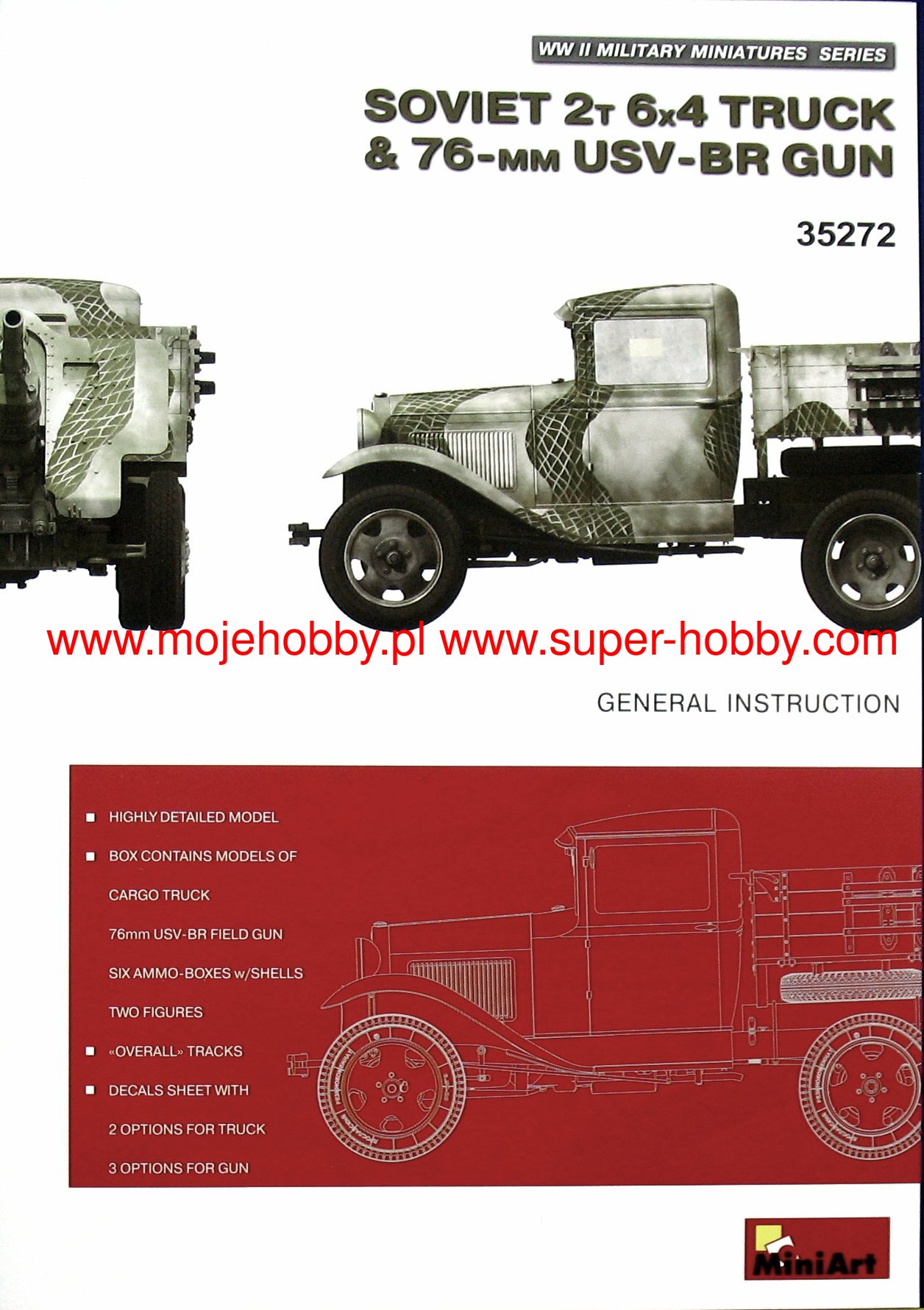 HIGHLY DETAILED MODEL BOX CONTAINS MODELS OF: CARGO TRUCK 76mm USV-BR FIELD GUN SIX AMMO-BOXES w/SHELLS TWO FIGURES “OVERALL” TRACKS DECALS SHEET WITH 2 OPTIONS FOR TRUCK 5 OPTIONS FOR GUN