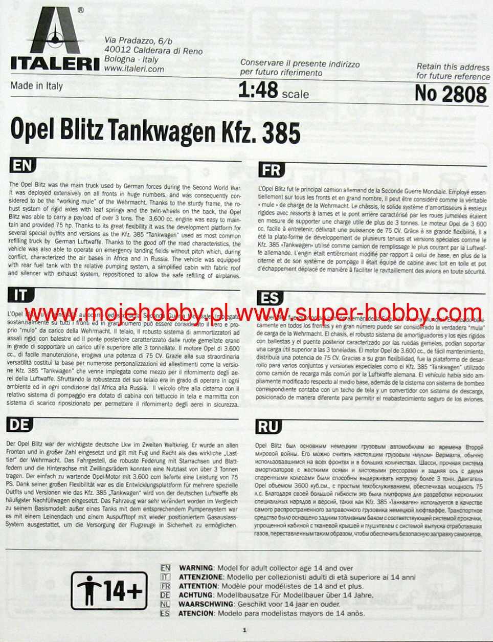 The Opel Blitz was the main truck used by German forces during the Second World War. It was deployed extensively on all fronts in huge numbers, and was consequently considered to be the “working mule” of the Wehrmacht. Thanks to the sturdy frame, the robust system of rigid axles with leaf springs and the twin-wheels on the back, the Opel Blitz was able to carry a payload of over 3 tons. The 3,600 cc. engine was easy to maintain and provided 75 hp. Thanks to its great flexibility it was the development platform for several special outfits and versions as the Kfz. 385 “Tankwagen” used as most common refilling truck by German Luftwaffe. Thanks to the good off the road characteristics, the vehicle was also able to operate on emergency landing fields without pitch which, during conflict, characterized the air bases in Africa and in Russia. The vehicle was equipped with rear fuel tank with the relative pumping system, a simplified cabin with fabric roof and silencer with exhaust system, repositioned to allow the safe refilling of airplanes.