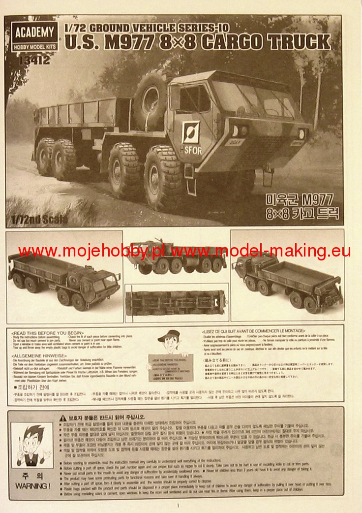 Описание Сборная модель в масштабе 1/72 от производителя Южно-Корейской фирмы Academy. На вооружении армии США состоит многоцелевой четырехосный полноприводный автомобиль М977 фирмы Oshkosh. Он предназначен для буксировки прицепов массой 10-15 т. На нем установлен 8-цилиндровый V-образный двухтактный дизель DDA 8V92TA жидкостного охлаждения. В трансмиссии применены гидромеханическая автоматическая 4- ступенчатая коробка передач Allison НТ 740D и 2-ступенчатая раздаточная коробка Oshkosh 55000 с блокируемым межтележечным дифференциалом. Ведущие мосты оснащены механизмом принудительной блокировки дифференциалов. Сборная проработанная несущая рама. Детально проработанные трансмиссия и подвеска, силовая установка за кабиной. Детали из прозрачного пластика для остекления.