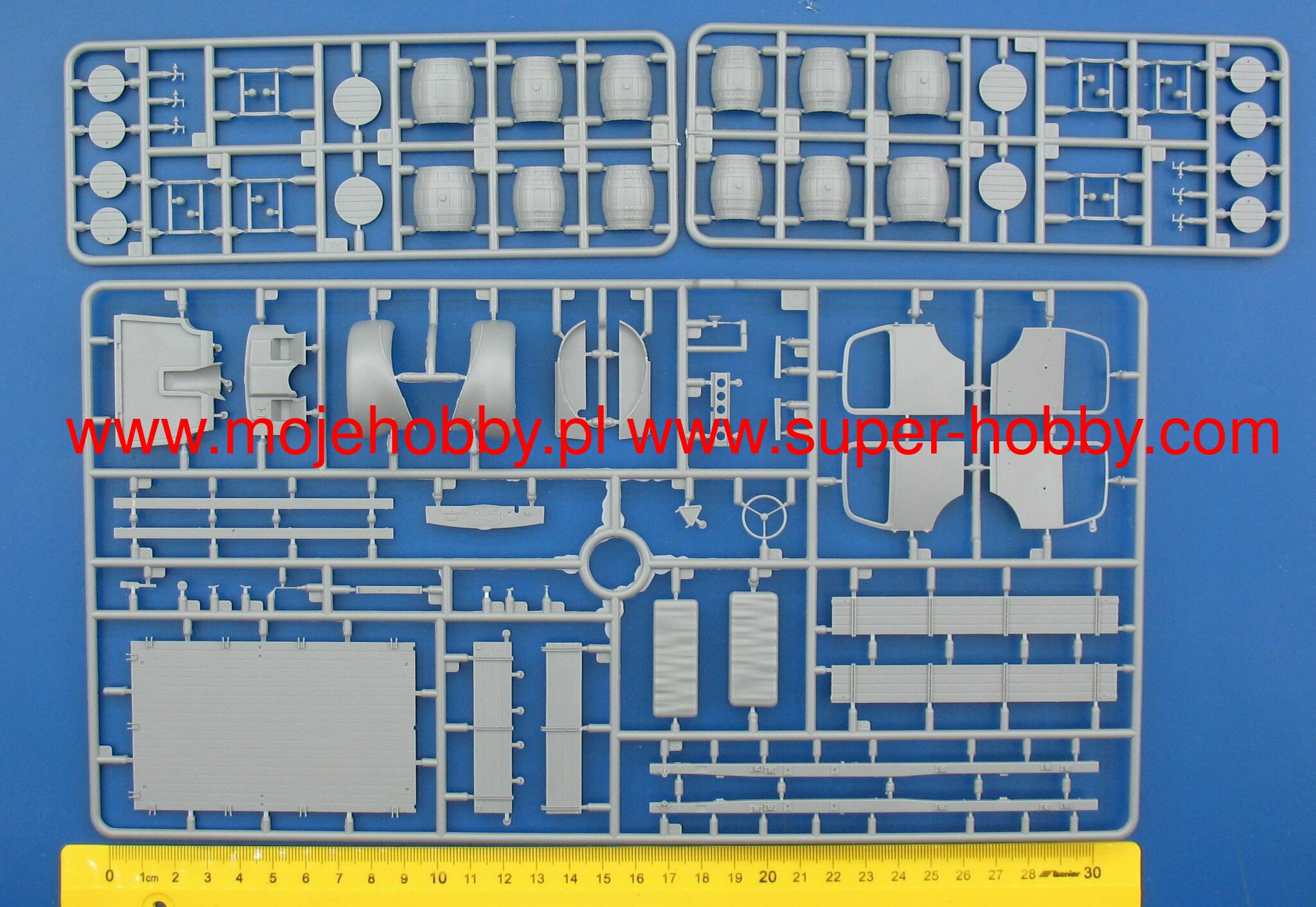 HIGHLY DETAILED PLASTIC MODEL KIT DOORS CAN BE ASSEMBLED IN OPEN OR CLOSED POSITION HIGHLY DETAILED ENGINE COMPARTMENT, TRANSMISSION, BRAKE, STEERING SYSTEMS PHOTO-ETCHED PARTS INCLUDED CLEAR PLASTIC PARTS INCLUDED BOX CONTAINS MODELS OF: CARGO TRUCK, TRAILER, WOODEN BARRELS DECAL SHEET FOR 2 OPTIONS