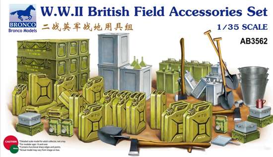 BRONCO AB3562 BRITISH FIELD ACCESSORIES SET /НАБОР КАНИСТР, БОЧЕК, ЯЩИКОВ, ЛОПАТ.../ 1/35