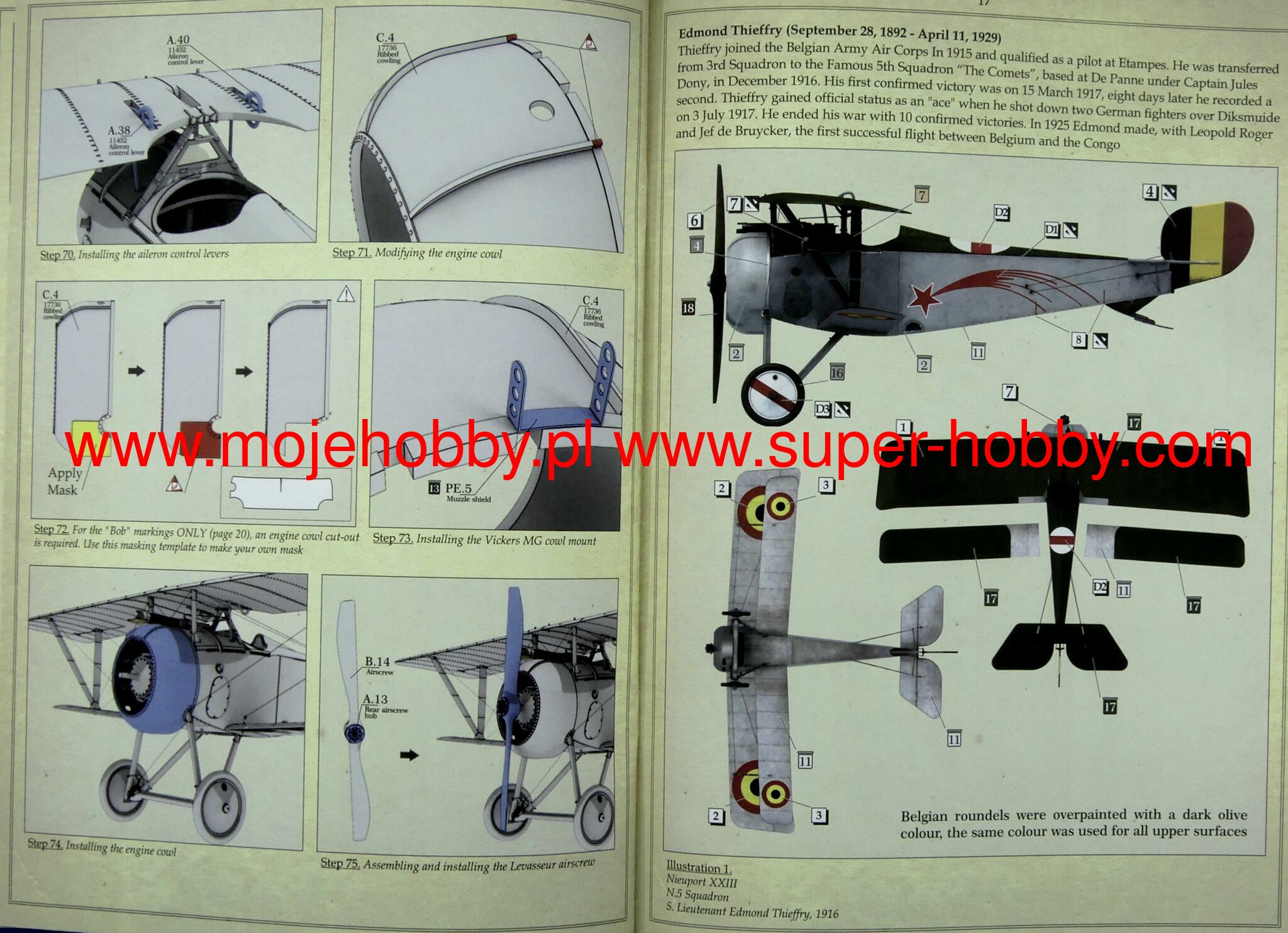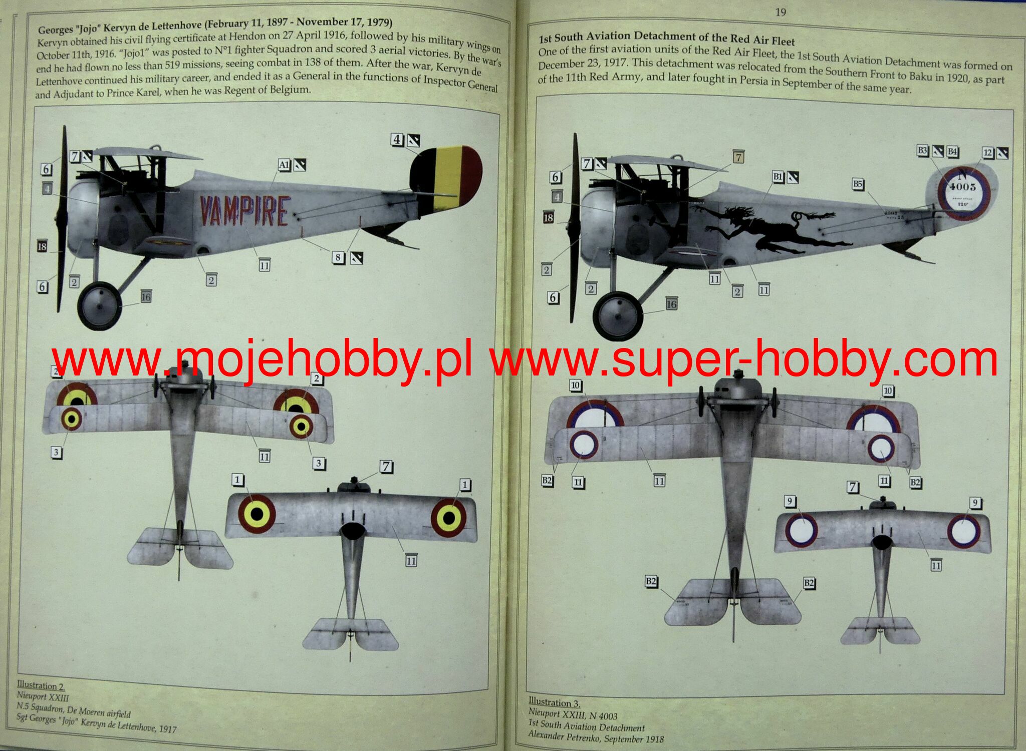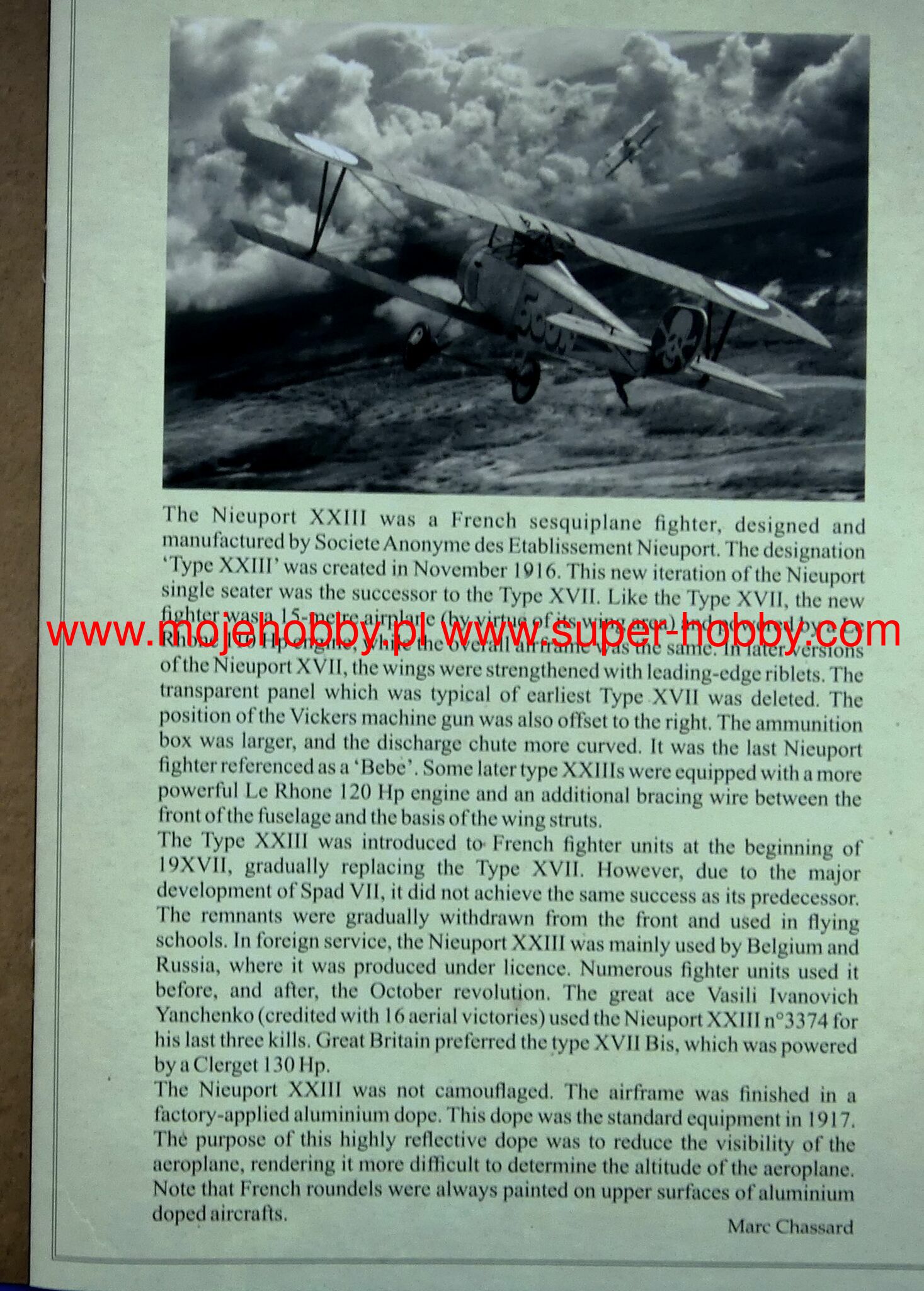The Nieuport 23 is a French fighter plane in a mixed half-wing structure with canvas covering most of the surfaces from the First World War. The prototype flew in 1917. The machine was a development of the great Nieuport 17 and outwardly did not differ much from it. However, it had a new 120HP Le Rhone 9Jb engine and a new machine gun synchronizer. The plane was used in aviation under the designation Nieuport 23C1. They flew on it, among others. French, American and Belgian pilots. Technical data: length: 6.4 m, wingspan: 8.2 m, height: 2.4 m, maximum speed: 168 km / h, rate of climb: 5.8 m / s, maximum ceiling 6500 m, armament: fixed - 1 Vickers machine gun 7.7mm cal.