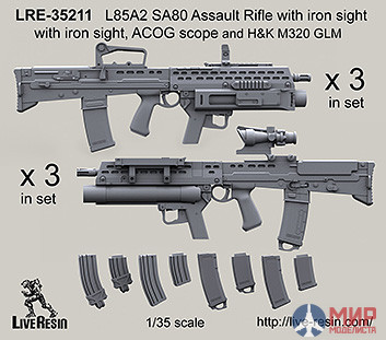 Подробное описание: Английская штурмовая винтовка L85A2 SA80 с механическим прицелом и прицелом ACOG с подствольным гранатометом H&K M320 GLM