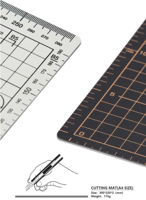 Описание Высококачественный трехслойный двухсторонний коврик для резки. Формат А4. Размер: 300х220мм. Верх и низ коврика выполнен из мягкого ПВХ материала, сердцевина же из более твердого АБС. Разметка выполнена в метрической системе. Коврик самовосстанавлювающийся, нанесенные порезы исчезают через небольшой промежуток времени. Не наносить клей, краску или растворитель на коврик, чтобы не повредить разметку. Не рекомендуется подвергать термическому воздействию.