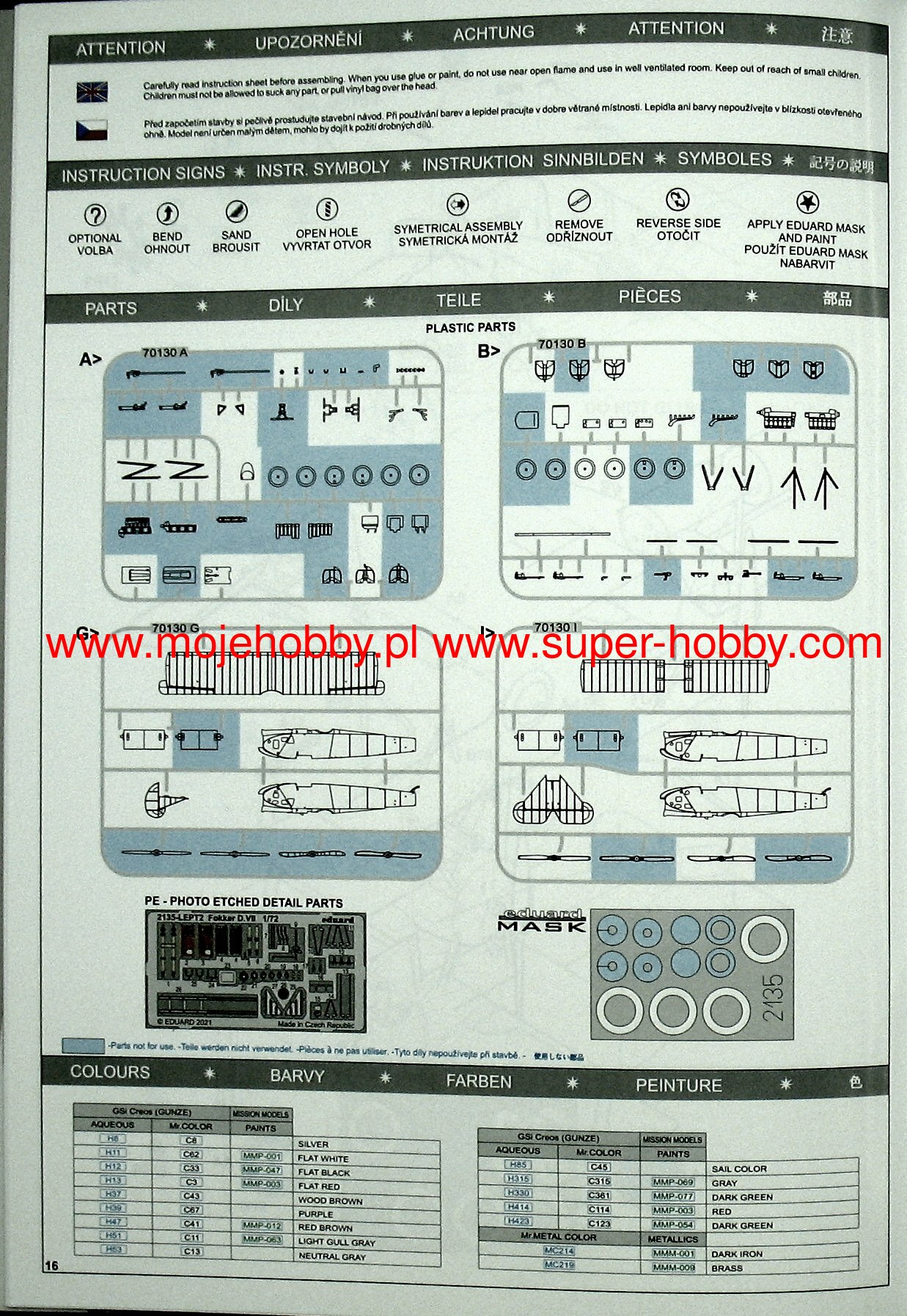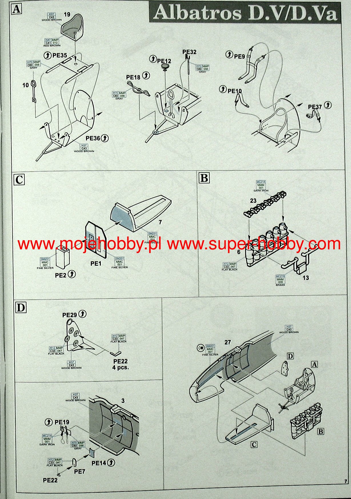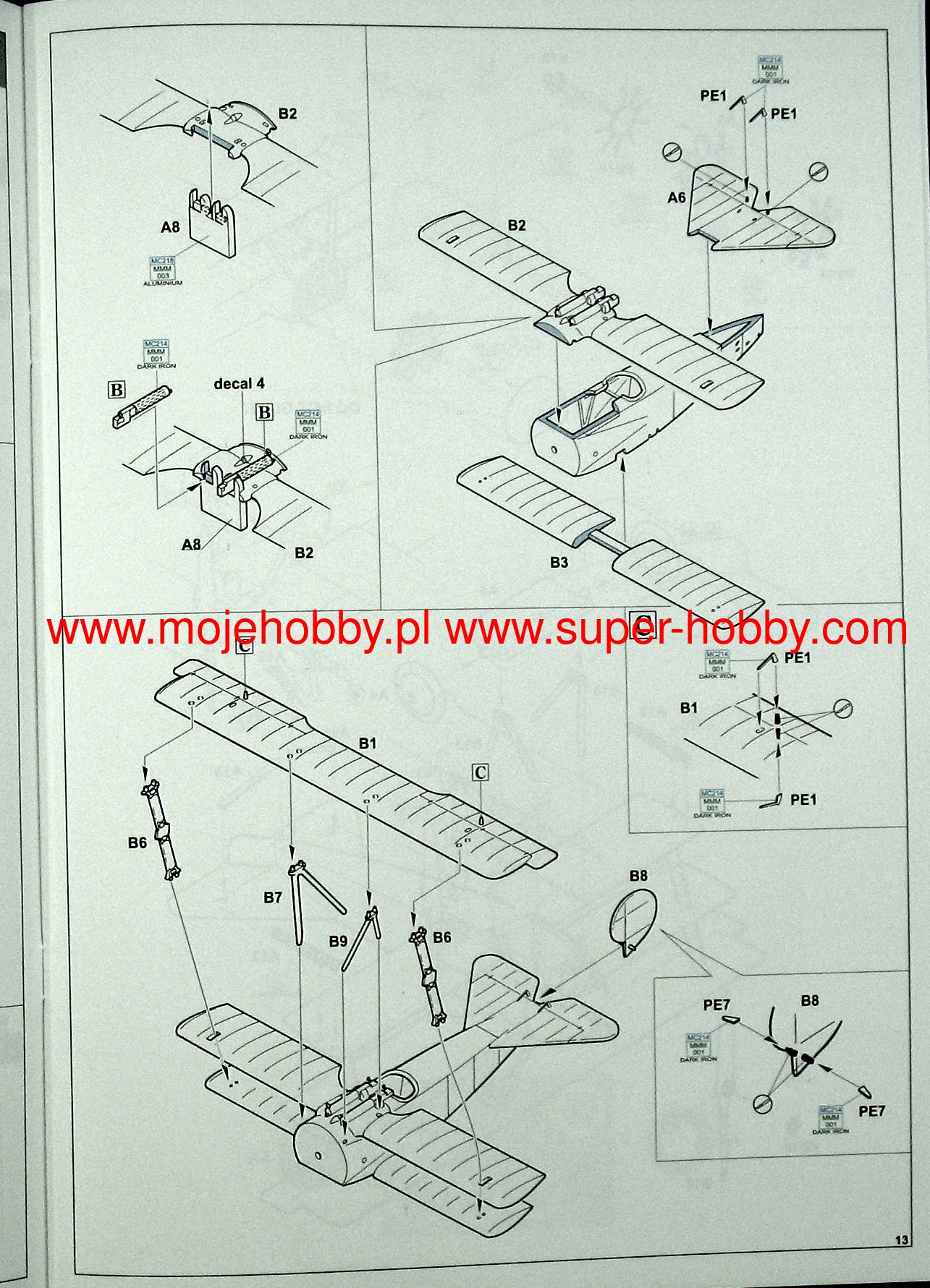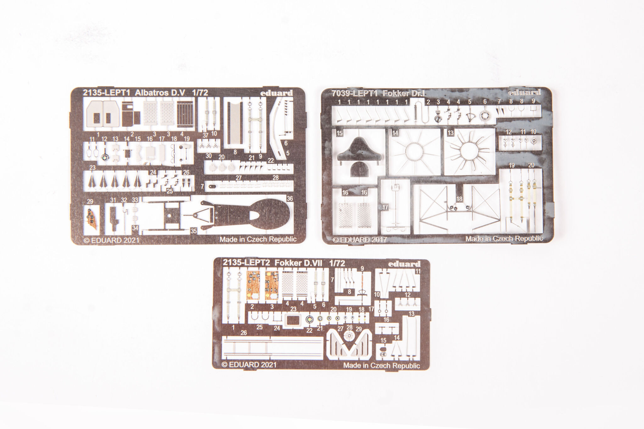 German Fokker Dr. I triple-lobe fighter plane from the First World War. The work of Anthony Fokker and Reinhold Plat. The plane was a German response to the appearance of the British Sopwith Triplane fighter. The Fokker Dr.I was characterized by fantastic maneuverability, a very high rate of climb, and achieved a decisive advantage in wheel combat with biplane planes. However, it had a low top speed (165 km / h), which was partly also due to the use of a weak 110 HP engine. The first pre-production vehicles (marked with the symbol V.5) were tested by eminent German pilots: Werner Voss and Manfred von Richthofen, nicknamed the "Red Baron". It was the latter who made this model of aircraft famous, winning many victories on it. Serial Fokker Dr. I planes served at the front from October 1917. until the end of the war. A total of 320 units were produced. Technical data: Top speed: 165 km / h; climb speed 5.7 m / s, maximum ceiling 6095 m, armament: two 7.92 mm Spandau machine guns, firing through a propeller.Albatros DV is a biplane of wooden structure with the front part of the fuselage, covered with aluminum sheet. The DV version did not differ much from its predecessor, the D.III series, mainly in terms of the fuselage section - the DV had an elliptical hull, which made it lighter by about 50 kg. The construction of the aileron drive was solved differently. These small changes seemed so small that the new aircraft was not even tested. The construction of the 1,5-wing aircraft, as in Nieuport, required a light aircraft. The inline albatrosses were too heavy for that. When recovering the aircraft from a dive flight, the lower lobe of the DV tended to break off frequently; this disadvantage was not eliminated by the end of the war. The D.Va version was stronger, but also heavier. About 900 Albatros DV series aircraft were built. Technical data: Maximum speed: 186 km / h; climb speed 4.2 m / s, ceiling practical 5700 m, armament: two 7.92 mm LMG08 / 15 machine guns.The Fokker D.VII is a German biplane fighter with a mixed structure (plywood, canvas, aluminum) from the end of the First World War. The flight of the prototype took place in January 1918, and in May of the same year, the plane entered service in the air. The Fokker D VII quickly demonstrated its superiority over the Allied aircraft. It had higher acceleration and a higher ceiling, which, combined with very good control devices, made the German pilots able to defeat 565 Allied machines in August 1918. Designed by Reinhold Platz, D VII was selected from among many other designs during the competition between January-February 1918. Baron Manfred von Richthofen (known as the "Red Baron") himself flew a prototype marked with the code V11. He later stated that the plane was easy to navigate, had a good climb rate, and was suited to "dive" flights in which the Fokker was found to be "rock hard". Other pilots also emphasized good visibility from the cockpit. The plane was of a mixed construction. The rectangular hull was made of welded steel pipes with a cloth cover. Only the nose of the fuselage housing the engine had removable side covers made of aluminum sheet. Double-girder panels, connected with each other by thin N-shaped stands, free-bearing with a thick profile, covered with plywood up to the first girder, the rest with canvas. The plane used Mercedes D.IIIa (180-200HP) or BMW IIIa 185HP engines as the drive. The BMW engine was a much better power unit, but as a result of limited production, the Mercedes engine was used on a much larger scale. It is worth noting that the Fokker D.VII flew min. Herman Goring, who achieved many air victories on it. The quality of the machine can be proved by the fact that it was produced until 1926. Technical data (for the version with the BMW-Fokker D.VIIF engine): length: 6.95 m, wingspan: 8.9 m, height: 2.75 m, maximum speed: 200 km / h, climb speed: 9, 52 m / s, maximum ceiling 6000 m, armament: fixed - 2 LMG 08/15 machine guns, cal. 7.92 mm. 3_edu2135_instruction_sheet.pdf