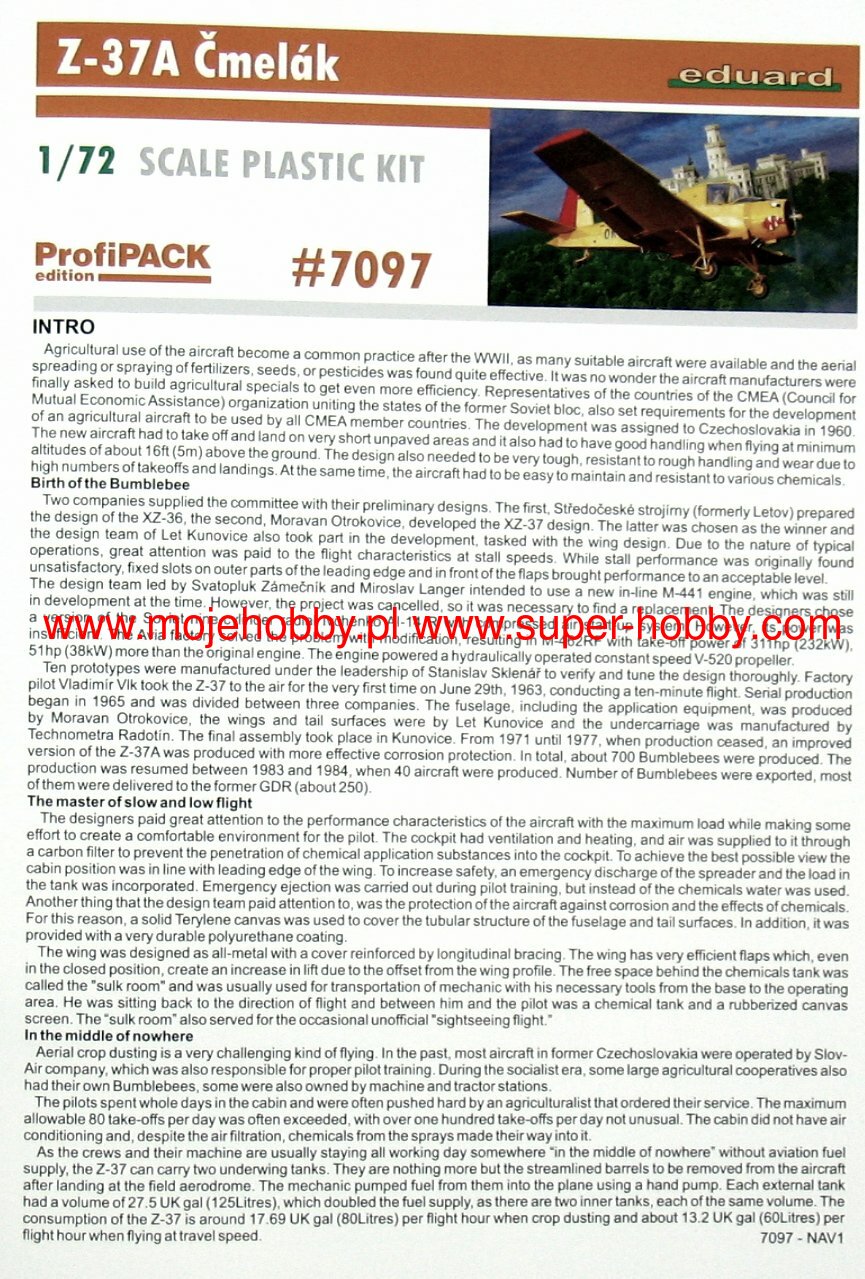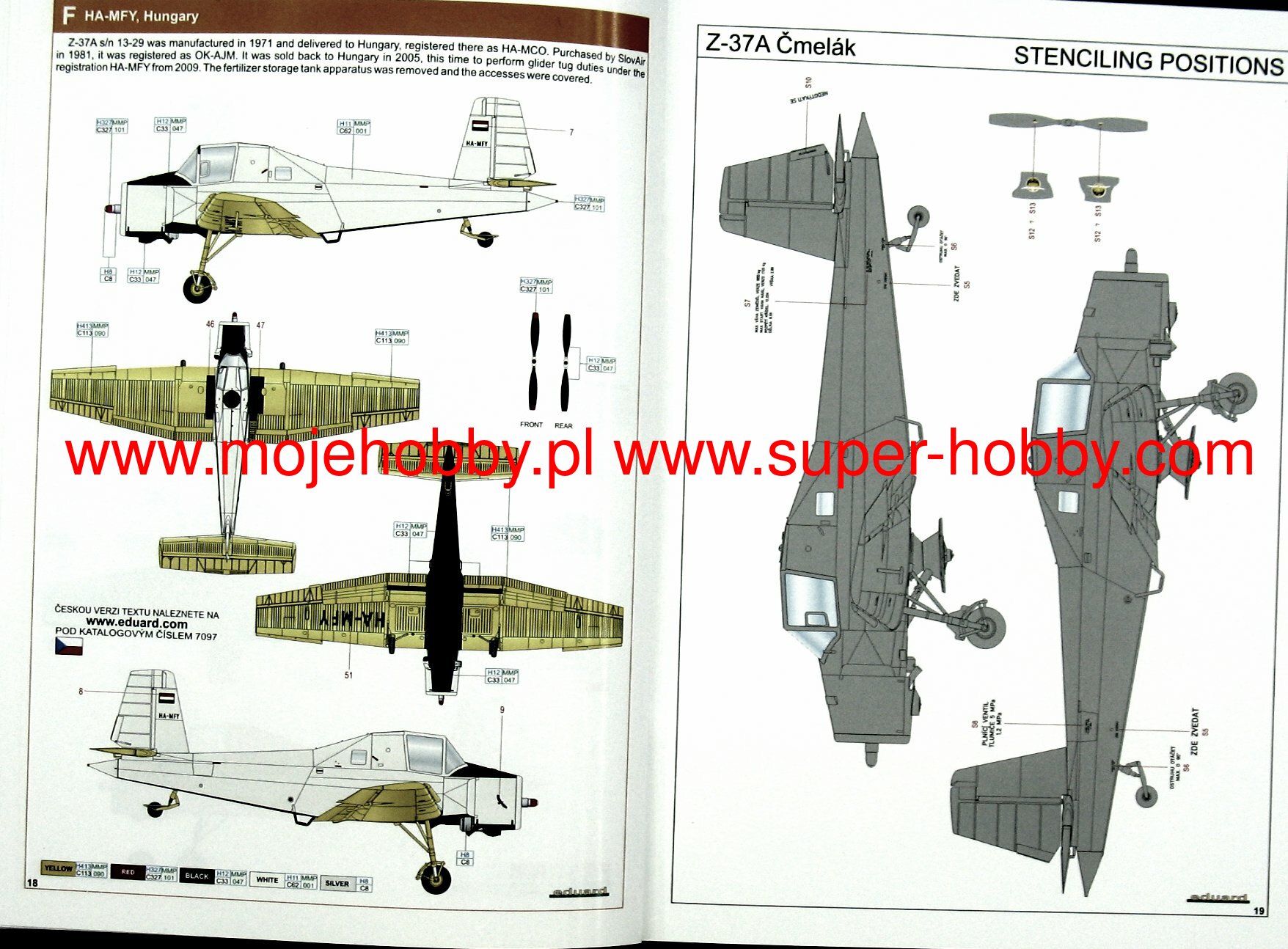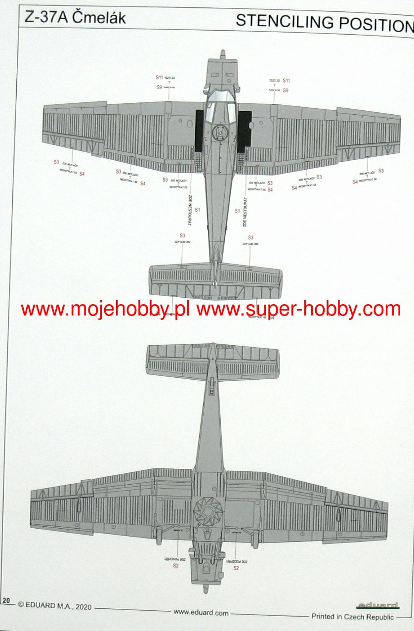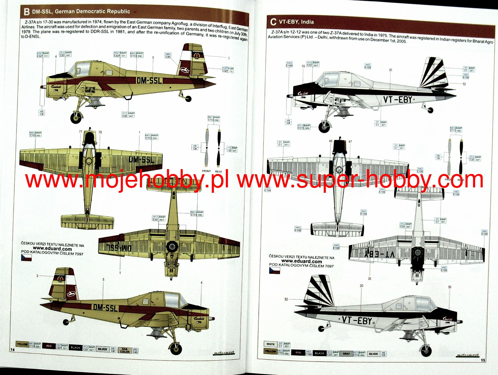 Zlin Z-37 Cmelak чехословацкий сельскохозяйственный и связной самолет. Полет прототипа состоялся в 1963 году. Серийное производство осуществлялось в 1965-1987 годах. В ее ходе было построено около 700 самолетов этого типа. Привод в варианте Z-37A обеспечивался одним двигателем Avia M462RF мощностью 315 л.с. Длина самолета составляла 8,55 метра при размахе крыла 12,22 метра. Zlin Z-37 Cmelak был создан в результате начатых в 1961 году работ между заводами Zlin и Avia. После относительно короткого периода исследований и разработок была создана машина в системе низкорасположенного крыла с классической ходовой частью, с относительно простой конструкцией и не высокими затратами на производство. В 1971 году в производство поступил вариант Z-37A с усиленной конструкцией. Также был создан учебный вариант (обозначение: Z-37A-2). Однако в 1985 году в производство поступила версия З-37Т с новым силовым агрегатом. Самолеты Z-37 в различных модификациях экспортировались во многие страны Восточного блока, а также в страны третьего мира. Они оказались удачными машинами и остаются на вооружении по сей день. 3_edu7097_instruction_sheet.pdf