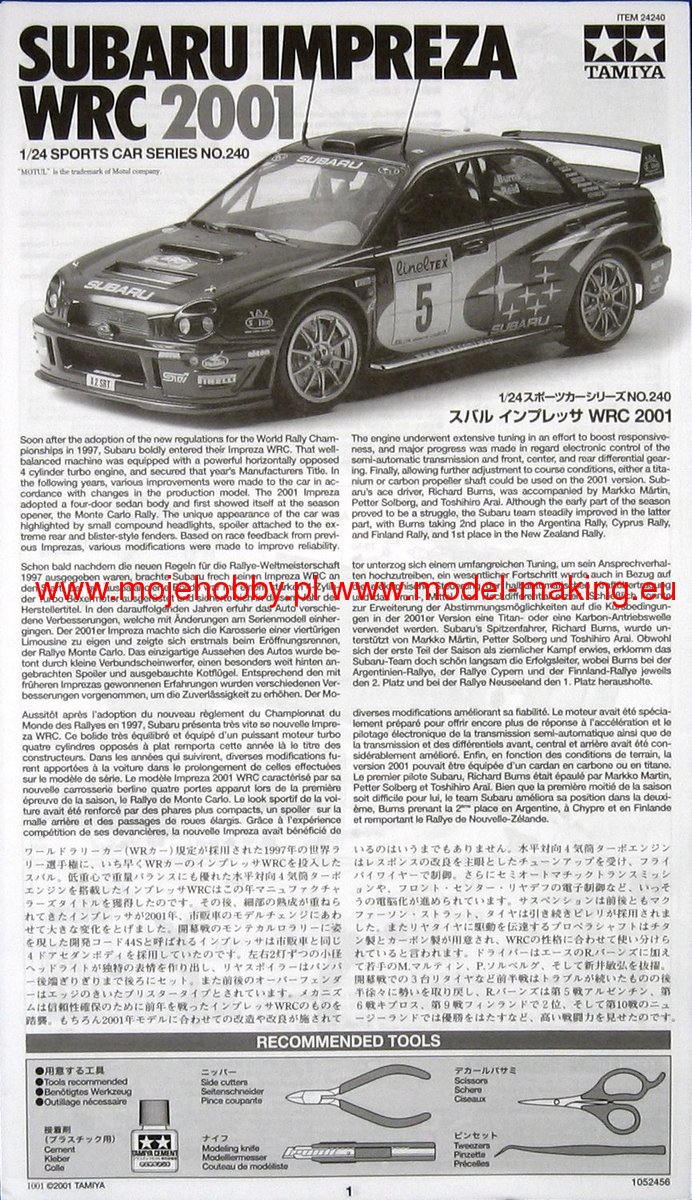 ОПИСАНИЕ ТОВАРА Набор пластиковых элементов для сборки модели автомобиля Subaru Impreza WRC 2001. Модель имеет высокую степень детализации с множеством конструктивных подробностей. Покрышки из синтетической резины. Колёсные диски с блестящим металлическим напылением золотистого цвета. Металлические самоклеящиеся элементы зеркал. Сборка элементов осуществляется при помощи специального клея. Внимание! Клей и краски в комплект не входят.