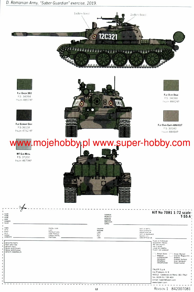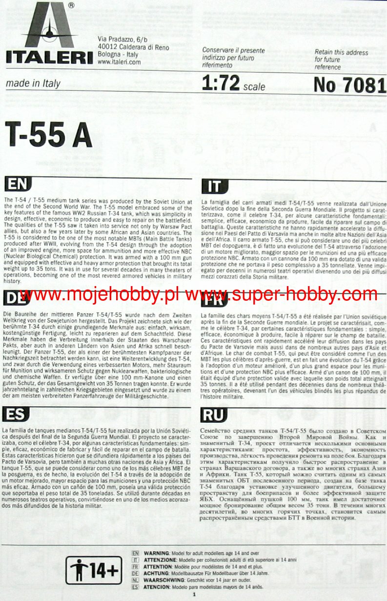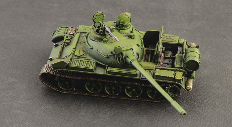 The T-54 / T-55 medium tank series was produced by the Soviet Union at the end of the Second World War. The T-55 model embraced some of the key features of the famous WW2 Russian T-34 tank, which was simplicity in design, effective, economic to produce and easy to repair on the battlefield. The qualities of the T-55 saw it taken into service not only by Warsaw Pact allies, but also a few years later by some African and Asian countries. The T-55 is considered to be one of the most notable MBTs (Main Battle Tanks) produced after WWII, evolving from the T-54 design through the adoption of an improved engine, more space for ammunition and more effective NBC (Nuclear Biological Chemical) protection. It was armed with a 100 mm gun and equipped with effective and heavy armor protection that brought its total weight up to 35 tons. It was in use for several decades in many theaters of operations, becoming one of the most revered armored vehicles in military history.