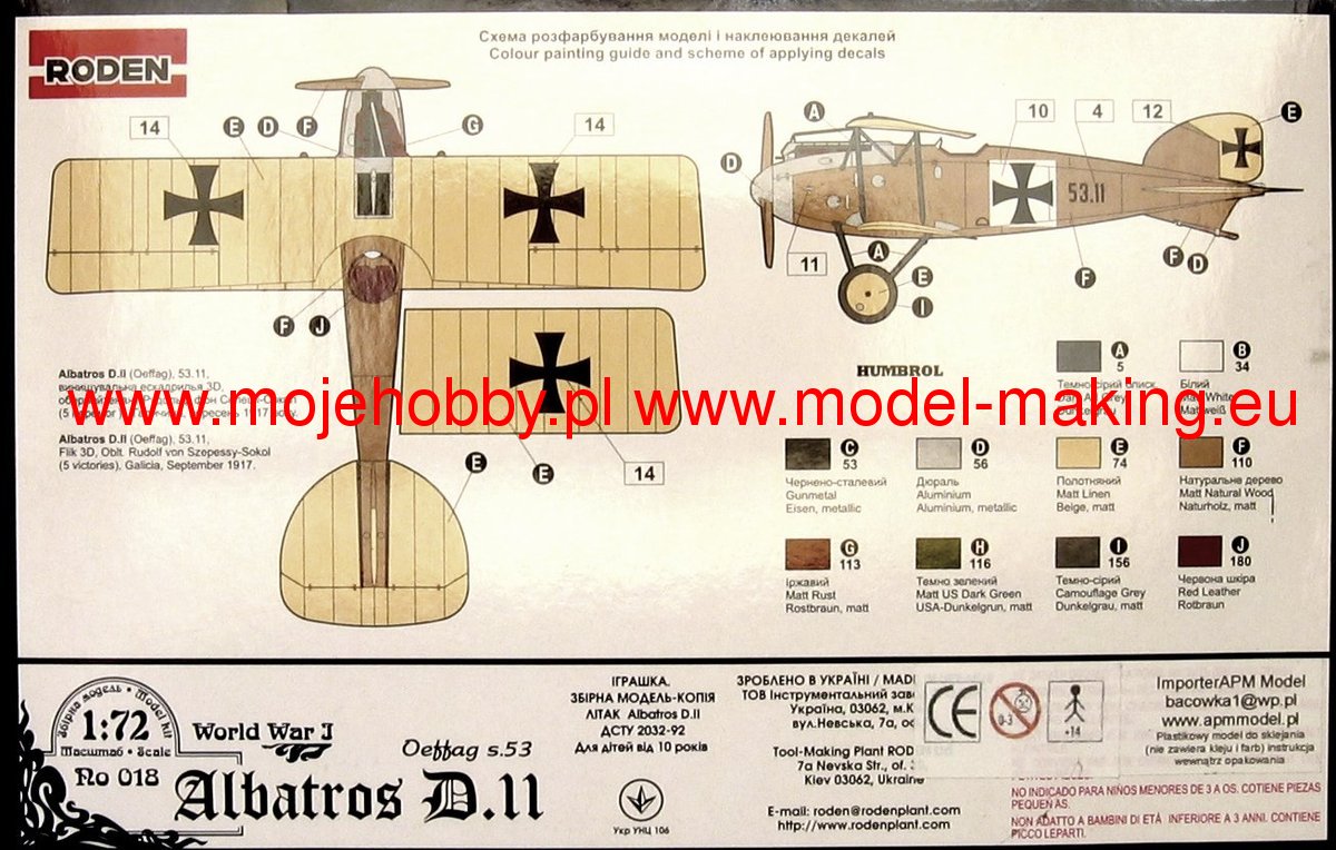 Albatros D.II was a development version of the Albatros DI aircraft.This model differed from the predecessor by 30 cm lower with the upper lobe and the replacement of the pyramids supporting the lamina from the shape of an inverted V-letter into the outwardly extended N-shaped supports. the front which was blocked by these pyramids. The plane was equipped with the same engine and externally did not differ much from its predecessor. The Albatros D.II planes used on a mass scale quickly regained air superiority for the German army. Oswald Boelcke died on this plane on October 28, 1916. He was hit in formation by one of his pilots. The machine was operational enough to land, but unfortunately Oswald fell into turbulence and crashed. The plane that nudged him managed to land. The Albatros DII was a single-seat fighter biplane with a half-shell fuselage structure with a working plywood sheathing. Rectangular panels of wooden structure, covered with linen. The plane was armed with two 7.92 mm Spandau rifles firing through the propeller circle with a Fokker synchroniser. Approximately 275 units of the Albatros DII were produced. The plane, however, was not as maneuverable as the French Nieuporty. In order to improve the situation in the next model, Albatros D.III, the "Nieuporta chamber" was used - the half-and-a-half system. Technical data: Top speed: 175 km / h; climb speed 3 m / s, maximum ceiling 5200 m.