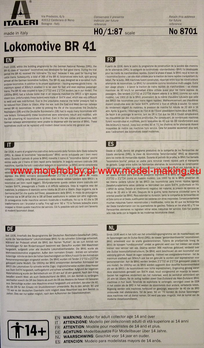 From 1936, within the building programme for the German National Raiways (DRG), the BR 41 class of “standard” locomotives was developed for fast good trains. During the trial period the BR 41 received the nickname “Ox loco” because it was used for hauling fast cattle trains. Subsequntly, a total of 366 of the BR 41 locomotives were built, split among almost all the German locomotive builders. The BR 41 was designed as a so-called multi-purpose locomotive. In addition to its proper application hauling express goods trains its maximum speed of 90km/h enabled it to be used for fast and even express passenger trains. HO/1:87 Scale