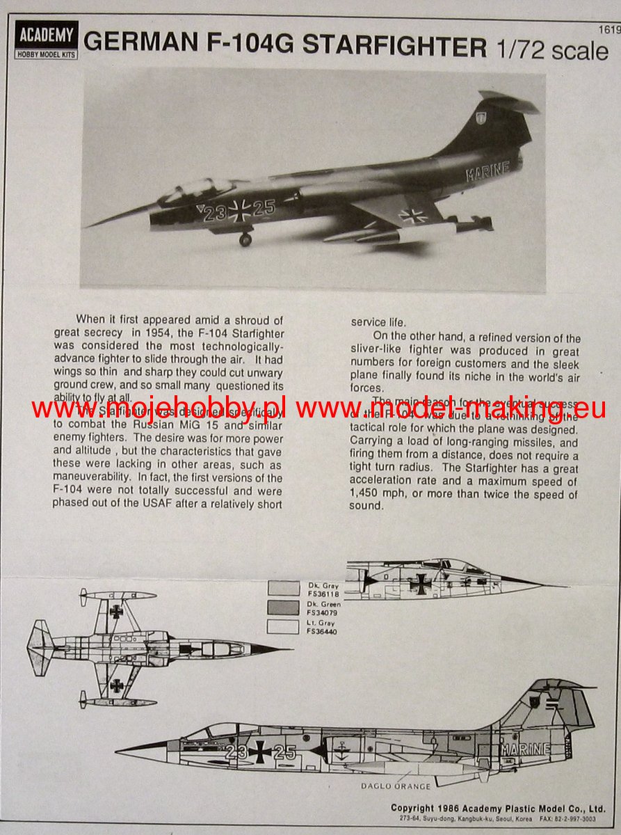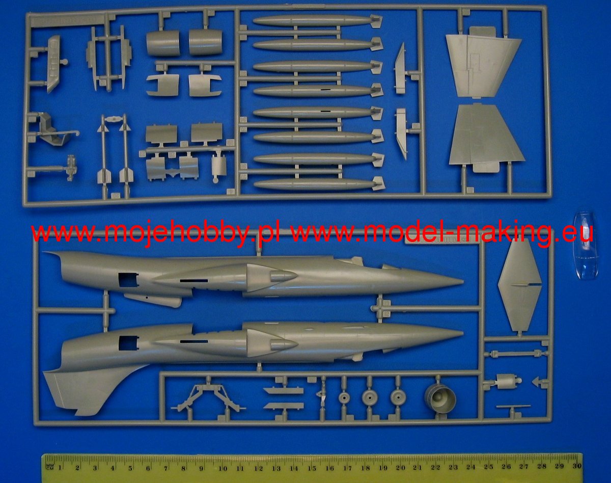 Комплект пластиковых деталей для сборки масштабной модели истребителя F-104G Starfighter в масштабе 1:72. Для сборки модели необходим специальный модельный клей. Для придания модели завершенного вида рекомендуется покраска. Внимание! Клей и краски в комплект не входят!