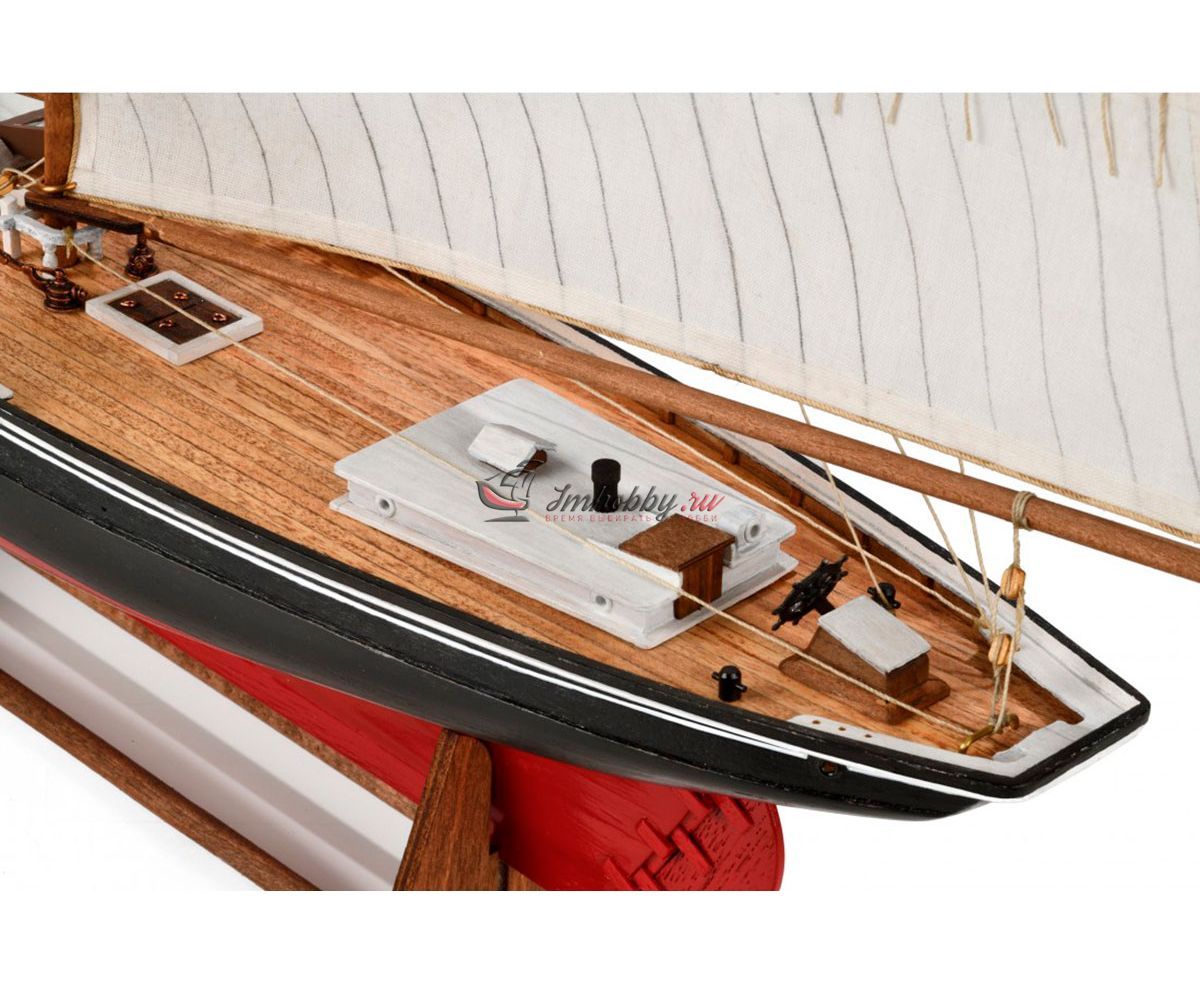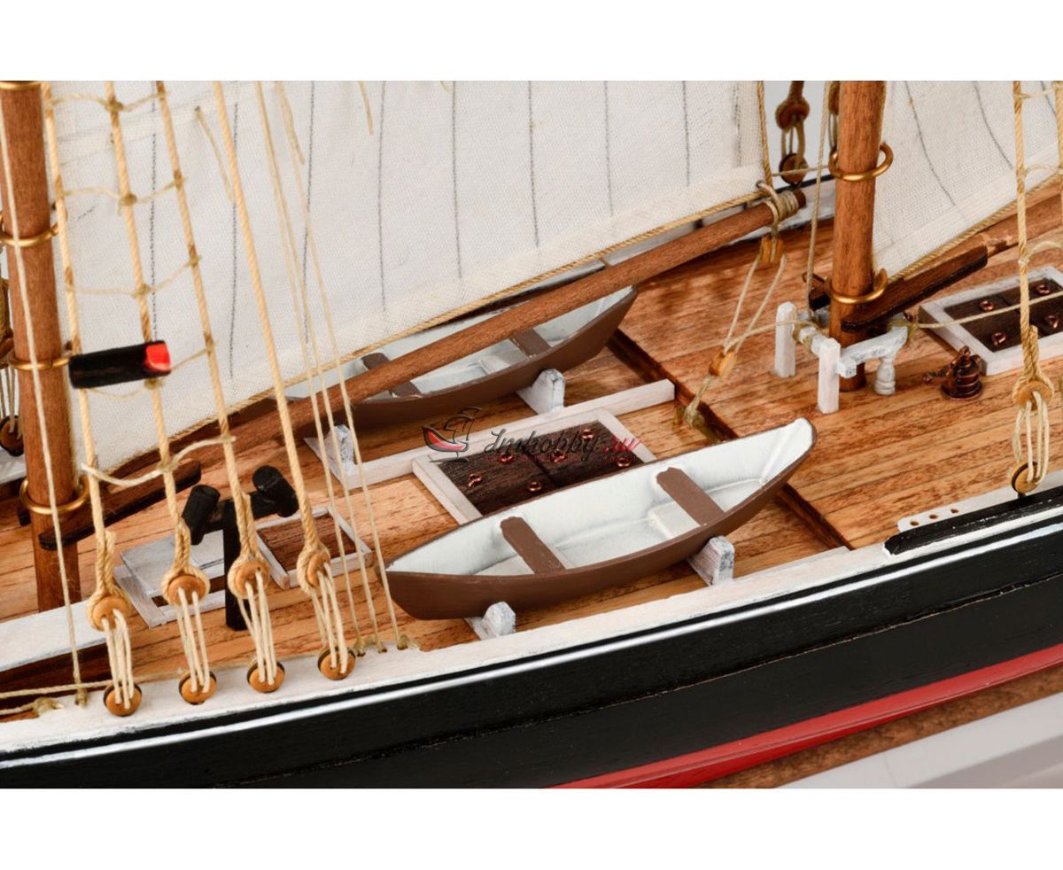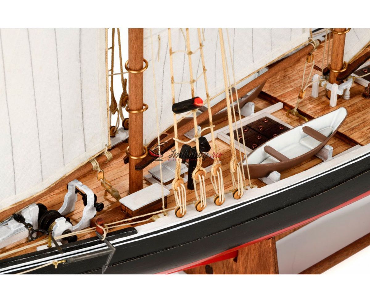 В 1920 Уильям Х. Деннис учредил International Fisherman' s Trophy - серию соревнований для рыбацких шхун, от берегов Lunenberg, в Новой Шотландии до Gloucester, в Новой Англии, с призовым фондом в 3000$. К регате допускались только настоящие рыбацкие шхуны. Первую победу одержала американская шхуна Эсперанто и это толкнуло Денниса и группу бизнесменов на то, чтобы создать компанию по постройке самой быстрой шхуны и взять реванш. В итоге, в марте 1921 года на воду была спущена шхуна BLUENOSE с водоизмещением 285 тонн.Осенью 1921 года BLUENOSE уже участвовал в "Fisherman' s Trophy". Успех ждал Bluenose во главе со шкипером Ангусом Вальтерсом уже в первой регате и был многократно закреплен последующими победами. Очень удачная конструкция позволила Bluenose оставаться непобедимой в течение нескольких лет.Спецификации:Масштаб - 1:100Длина - 540 ммВысота 430 ммМузейное качество.Изготовитель анонсирует эту модель как "легкую в изготовлении".