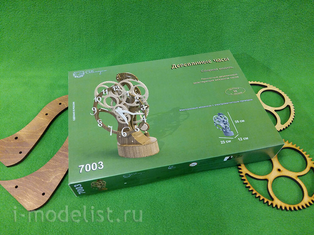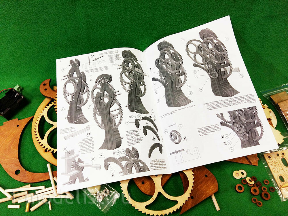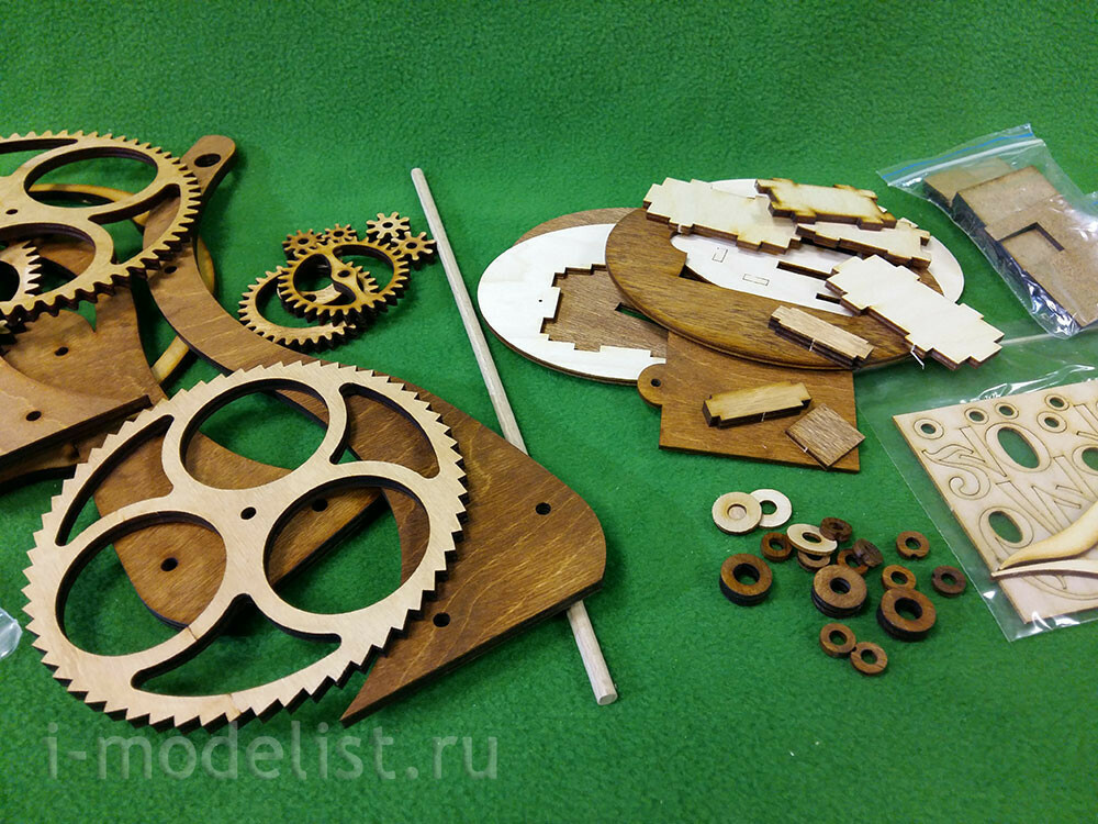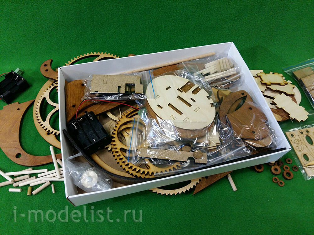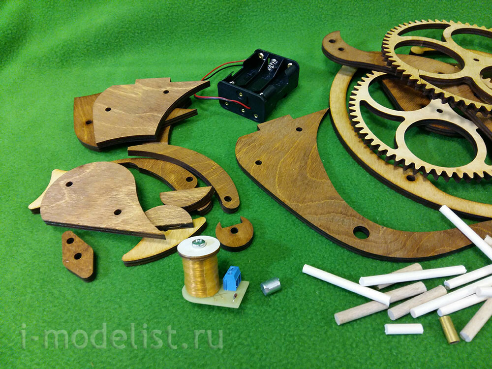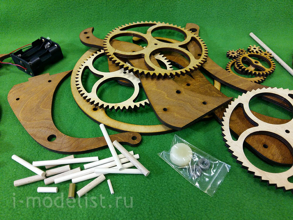 Дополнительная информация 100 деталей Размеры 23х10х30 см действующий механизм лазерная резка средний уровень сложности Изюминка данных часов - необычный спусковой механизм, который при работе напоминает движения клюва птицы тукан. В часах применен электромагнитный привод маятника. Его принцип действия основан на отталкивании постоянного магнита, закрепленного на конце маятника, электромагнитной катушкой в момент прохода маятника над катушкой. Питание осуществляется от 6 элементов АА, размещенных в основании часов. При этом, никакого "электронного" управления, как скажем, в кварцевых часах, здесь нет - даже точность хода часов настраивается механически - перемещением линзы (грузила) маятника. Все детали часов выполнены лазерной резкой из предварительно мореной фанеры.