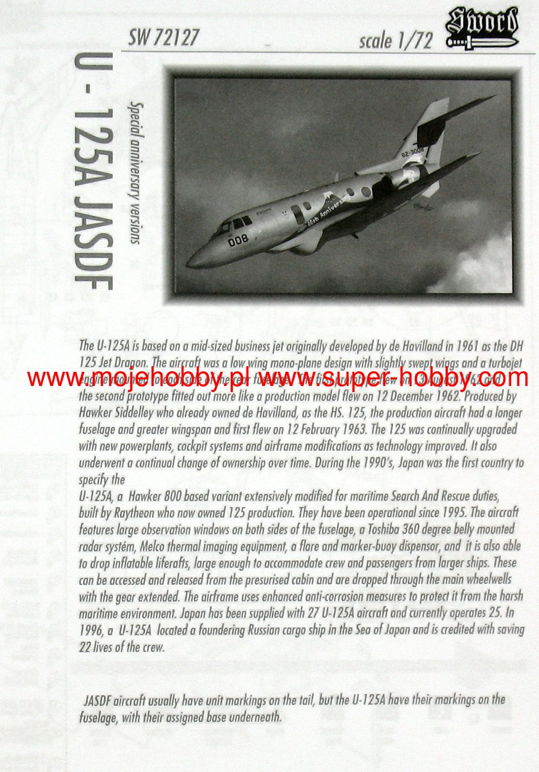 Описание U-125 A современный японский военно-морской спасательный самолет с низкорасположенным крылом. За основу машины был взят британский гражданский самолет Hawker 800 производства авиационной компании Hawker Beechcraft, который поднялся в воздух в 1983 году. U-125 A, по отношению к машине Hawker 800, отличается в первую очередь гораздо большими иллюминаторами для наблюдения за морской акваторией и установкой специализированного оборудования, такого как эжектор и световые ракеты, поисковый радар Toshiba или тепловизоры. . Также полностью изменено БРЭО машины, особенно средства связи. Стоит отметить, что самолеты U-125 A сотрудничают со специализированными версиями вертолетов Sikorsky UH-60J в Морском спасательном крыле, базирующемся в городе Сакаяма. Стоит добавить, что версия Hawker 800 (именно модель XP) используется ВВС Южной Кореи в качестве машины радиотехнической разведки и разведки.