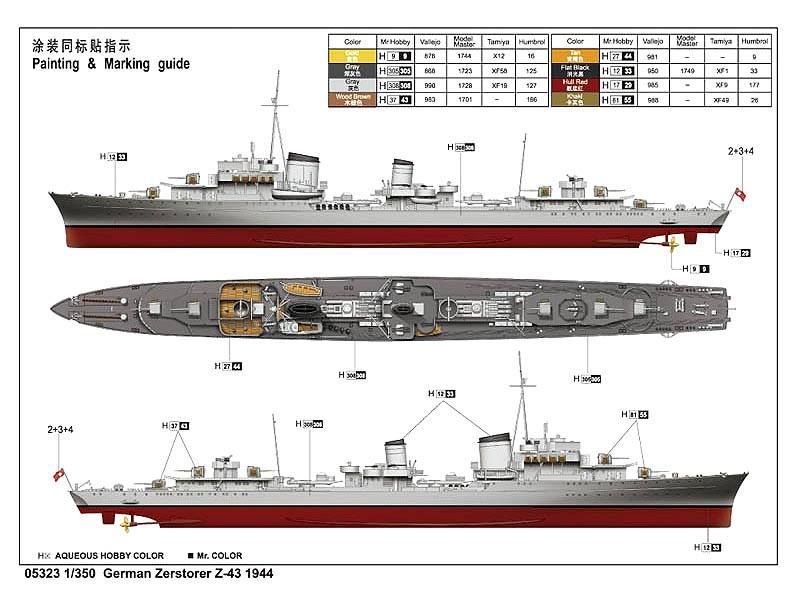 Z-43 вошел в строй 24 марта 1944 года. Это был эсминец Типа 1936Б. всего было введено в строй три корабля этого класса. Остальные два так и не были завершены. Эсминцы типа 1936А предназначались для установки передних орудий в сдвоенной башне, но, поскольку сдвоенные башни не были готовы вовремя, они изначально несли одиночные орудия. Когда башни были наконец установлены, они оказались слишком тяжелыми для существующих конструкций. На носу было добавлено усиление, но это мало помогло улучшить мореходные качества. По этим причинам основное вооружение эсминцев типа 1936Б сократилось до одиночных орудий калибра 127 мм. Эффективность этого изменения не была доказана в открытом море, поскольку этот класс работал только в Балтийских и прибрежных водах. Комиссионный товар