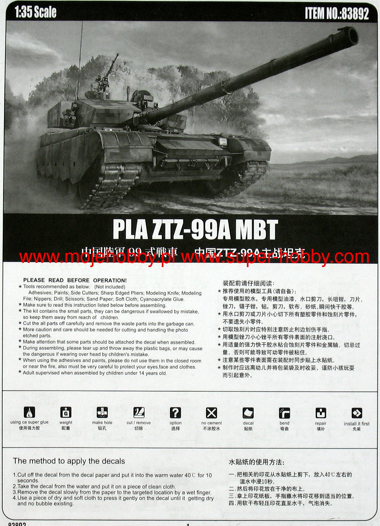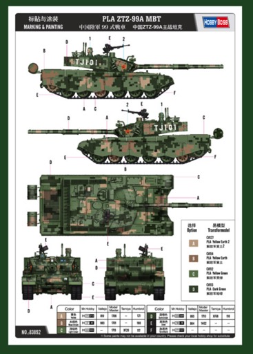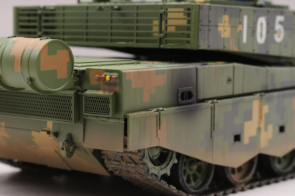 The ZTZ-99 or Type 99 is a modern 3rd generation Chinese Main Battle Tank. The first prototypes of the vehicle were probably created in the mid-1990s, and serial production started in 2001 continues to this day. So far (2018), approximately 300-500 tanks of this type have been produced. The ZTZ-99 is powered by a 1500 HP diesel engine. The vehicle is armed with a single 125mm ZPT-98 tank gun. In addition, the tank's armament consists of 2 machine guns: cal. 12.7 mm and 7.62 mm. The ZTZ-99 was created as a successor to the Type 85 tank and a very far-reaching development of the ZTZ-98G vehicle. Chinese designers set themselves the goal of the ZTZ-99 to create a machine that would be able to match Western designs like the Leopard 2A6 or M1A1 Abrams. Despite being kept secret of more precise data on the ZTZ-99, it is undoubtedly the most modern tank of the PRC army. It has effective main weapons, probably only slightly inferior to Western solutions. It also has a powerful 1500 HP engine, giving it good maneuverability and off-road mobility, and finally has a modern SKO (fire control system) and good observation devices. It almost certainly uses composite armor with elements of reactive armor. In 2007, the tests of the ZTZ-99A car were also revealed, with even better armor and - probably - an active defense system. Without a doubt, the ZTZ-99 is a significant advance in Chinese armored weapons with combat values comparable to those of the Western ones.