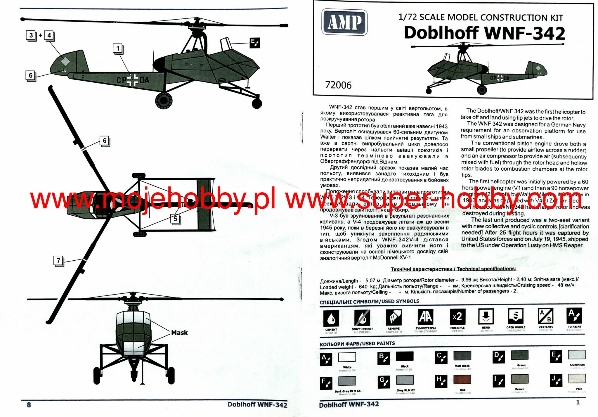 The Doblhoff WNF 342 was a prototype German light helicopter from the Second World War. The flight of the first prototype took place in 1943. In the WNF 342 V4, the drive was provided by a single BMW-Bramo Sh.14A engine with 140 HP. The main rotor diameter was 10 meters, and the curb weight was up to 430 kilograms. The maximum speed was around 50 km / h. Doblhoff WNF 342 was developed at the Wiener-Neustädter Flugzeugwerke aviation plant by Friderich von Doblhoff for the needs of the German Kriegsmarine, which aimed to obtain an observation helicopter as cheap as possible, capable of operating from the decks of small surface ships and U-boats. Finally, a helicopter with a highly unusual design was created, with a main rotor and a single push propeller, and a tail fin located on a double tail beam. It is worth noting that a total of three examples of this atypical aircraft were made, designated as WNF 342: V1 / V2, V3 and V4. They differed from each other, for example, in the used drive unit or the diameter of the main rotor. However, the machine did not enter serial production.
