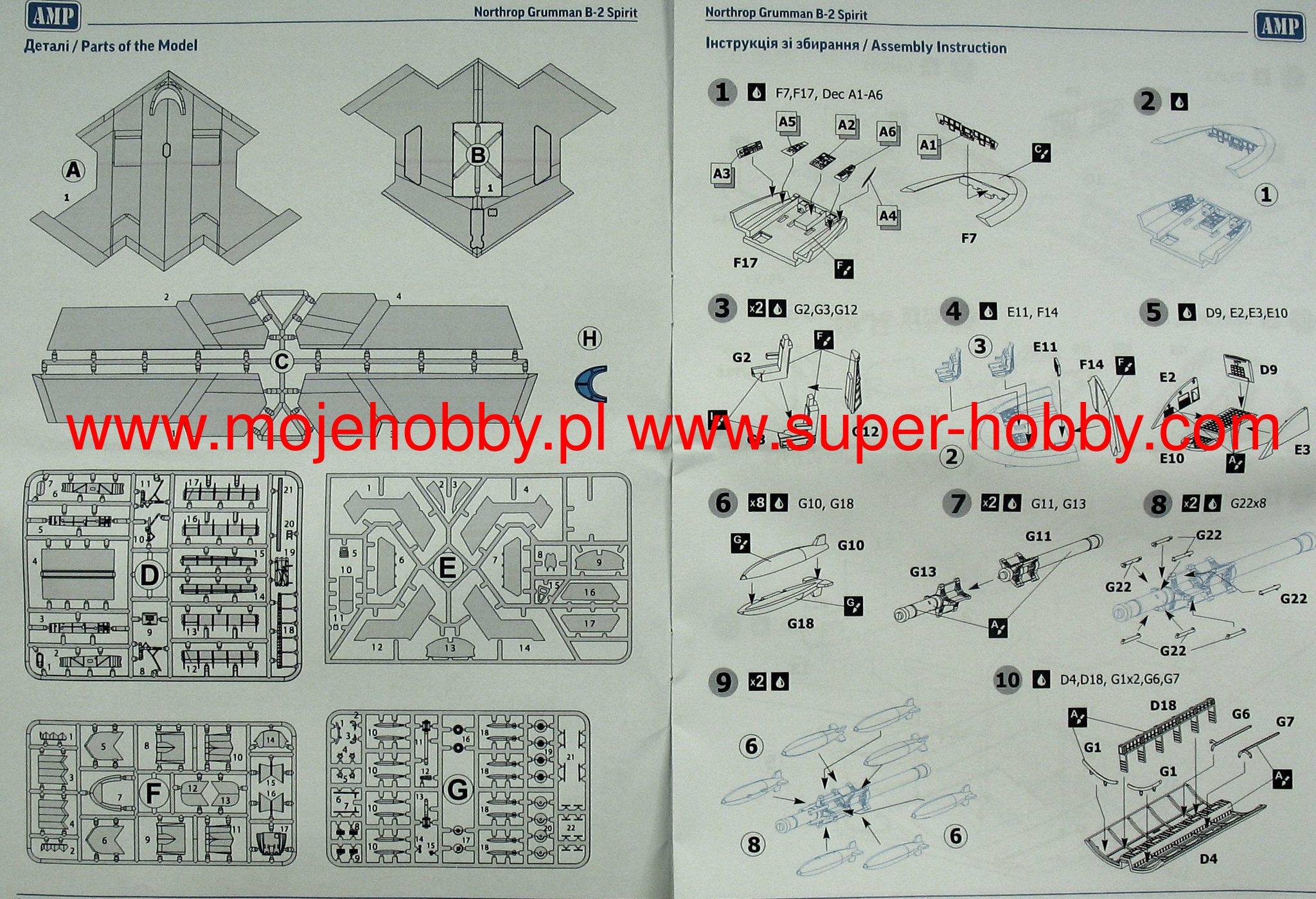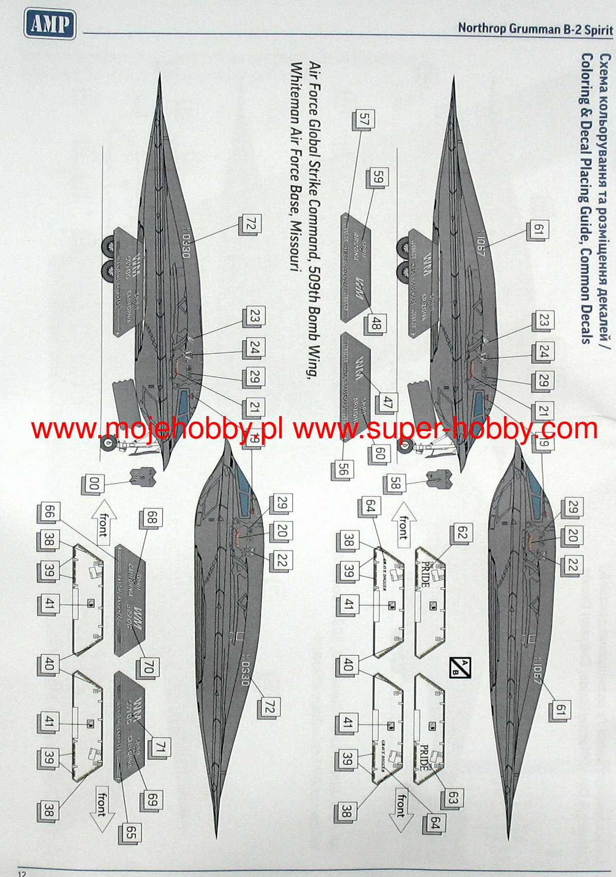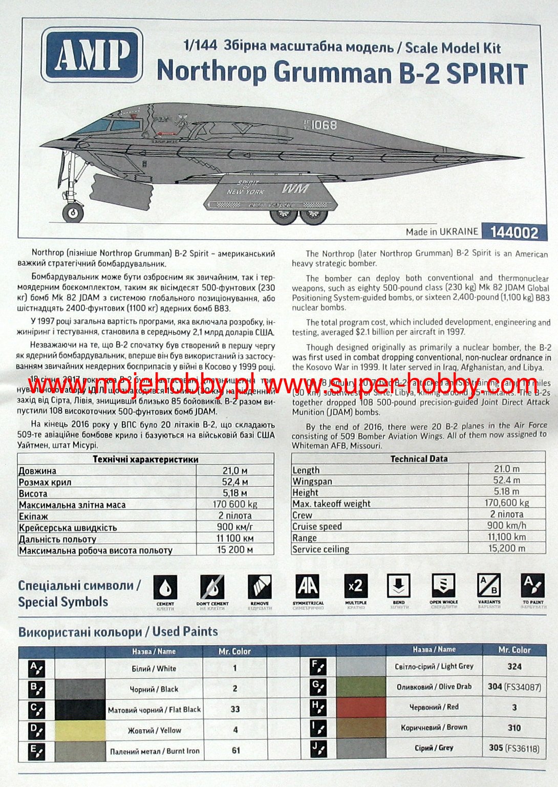 In June 1977, US President Jimmy Carter decided to suspend the construction program of the new B-1A strategic bomber. This meant that the B-52, with almost twenty years of service behind it, would remain the basic type of American aircraft for many years to come. Meanwhile, the USAF decided to start work on a new bomber based on completely new technologies (ATB - Advanced Technology Bomber). Its main advantage in the confrontation with the Soviet anti-aircraft defense system was to be the feature of "invisibility" or, in other words, low observability of the aircraft for radar devices. The first work on the ATB bomber was carried out in 1978. The main contractor for the ATB project was the Northrop / Boeing team, in which Northrop played a leading role, while Boeing became the main cooperator. The design of the ATB aircraft was based on the strict requirements for long range, high armament load and, of course, low level of observability. Like any of the stealth aircraft construction programs, the ATB program was top secret. From unconfirmed sources it appears that the piloted B-2 model took off for the first flight in mid-1989. The fact is, however, that this structure in the 1: 1 scale was built using only model tests (without building a mock-up of the aircraft) and with a very wide the use of computer aided design. The B-2 plane was designed with unprecedented accuracy of reproducing its geometry. One of the most difficult problems that was solved was the creation of a three-dimensional database for mapping the body of the aircraft. However, this problem was resolved and the B-2 is the world's first aircraft of this size and complexity to be built without the need to build a dummy. During the development of the aircraft, almost 900 new materials and technological processes were patented. In summary, the work on the B-2 became an impulse for the development of new design and construction techniques. Originally, the USAF expressed an interest in purchasing 132 copies, of which 120 were designed to carry nuclear weapons. However, the rapidly changing political and economic situation in the world (the collapse of the USSR) resulted in the reduction of orders to 21 units. The B-2 is a two or three seater (depending on the difficulty of the planned missions) strategic bomber, built in a flying wing configuration. The plane forms a wing with no fins understood in the classical sense. The airframe consists of practically four main parts: a center wing, two attachable wings (caisson structure) and a center wing segment being its stern part. The center wing, resembling a trapezoidal box, houses the weapons compartments, four engine nacelles, landing gear compartments, equipment and a crew cabin for three people. In the upper part there are air inlets, shifted back to the leading edge. The airfoil is equipped with multi-part moving surfaces located on the zigzag trailing edge and acts as controls (height and direction), ailerons and flaps. The two surfaces attached to the wing consoles are divided horizontally into two segments (upper and lower) each. They spread out to play the role of the rudder (with asymmetrical spreading of both consoles) or of air brakes (with symmetrical spreading). The movable control surfaces take up about 15% of the total lift area of the aircraft (69.675 m2, for comparison the maximum lifting area of the Su-22M4 aircraft is 38.49 m2). The basic construction materials of the airframe are composites, mainly - epoxy-carbon and epoxy-aramid (kevlar). Honeycomb structures have been widely used for the covering and internal components of the structure. The surface of the plane was covered with a special varnish that disperses radar radiation. Three-support chassis with front support point; main - bogie, pulled up towards the plane of symmetry of the plane, front - two-wheeled, pulled to the rear. The aircraft is propelled by four General Electric F118-GE-110 two-flow jet engines without afterburners with a thrust of 4 x 84.50 kN. They are located inside the lobe, in its upper part. The exhaust nozzles are located above a relatively large surface, and the exhaust gases are cooled by a stream of cold air, which allows to reduce the thermal signal and noise of the drive units. It is possible to install a special device for mixing exhaust gases with fluorosulfuric acid in order to prevent the formation of visible condensation streaks when flying at high altitude. The plane is equipped with a digital control system with a four-time reservation. In addition to the basic tasks performed by classic control systems, it effectively reduces operational overload (by changing the load distribution) and gusts, improving flight comfort and safety at low altitude. This system is most likely adapted to automatic flight stabilization in the event of engine failure (thrust asymmetry) or other types of damage, e.g. mechanical airframe (overshoot, etc.). Western sources say that the B-2 has a maneuverability not inferior to that of fighter planes. Stealth properties were achieved by adopting a flying wing system, curvilinear shapes, the use of RAM (electromagnetic energy absorbing) materials and appropriate structures that absorb or scatter radar radiation. The outline of the plane in the top view consists of twelve straight lines directed in strictly defined directions. The curvilinear contour of the airframe, from the canopy to the air inlets, is shaped by the same set of rules. RAM materials were used for the leading edges of the airfoil and the wing tips, and in the brackets inside each inlet. Probably most of the plane's surface is covered with honeycomb structures that absorb (scatter) radar waves and a varnish containing heavy absorbents. Additionally, the B-2 is made almost entirely of composite materials. Due to the applied solutions, the radar station with typical wavelengths detects the plane flying towards the station from a distance of approx. 20 km. For comparison, the same station