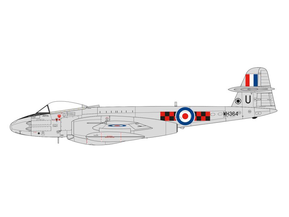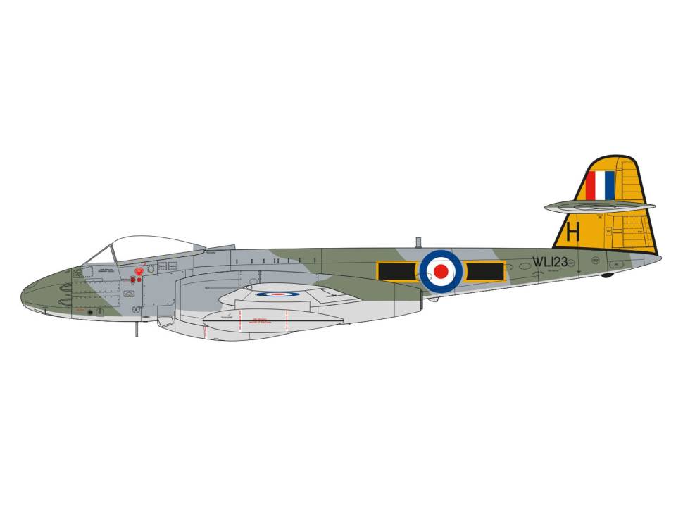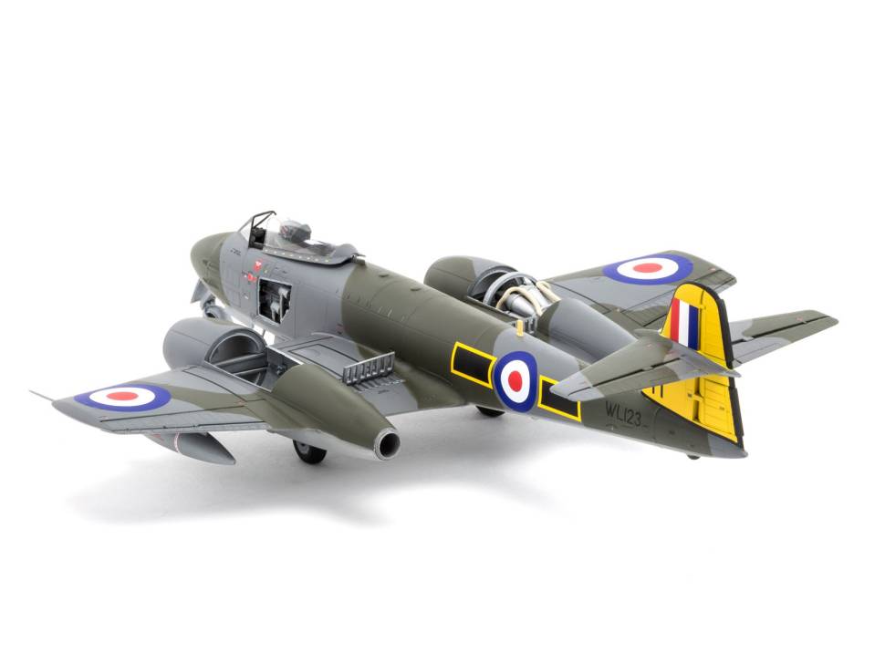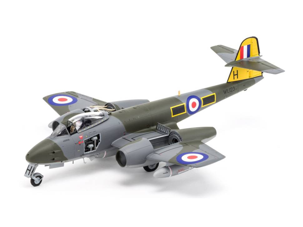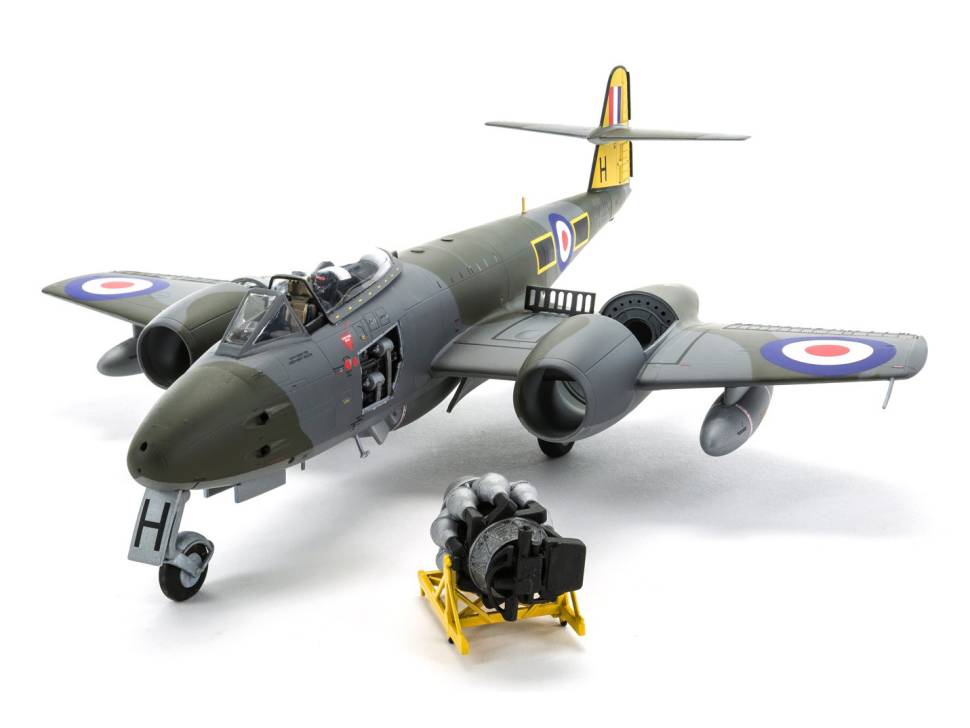 Gloster Meteor первый британский реактивный истребитель, единственный реактивный самолёт союзников, принимавший участие во Второй мировой войне. Самой многочисленной моделью (всего 1183 машин) был самолёт Метеор F.Mk 8, который совершил первый полёт 12 октября 1948 года. Он имел удлинённый фюзеляж, измененное хвостовое оперение, дополнительный топливный бак объёмом 432 литра и цельноштампованный фонарь. Дополнительное оборудование включало в себя гироскопический прицел и катапультируемое кресло Martin-Baker. На нём были установлены турбореактивные двигатели Дервент 8 тягой 1633 кг, что позволяло развивать предельную скорость почти 966 км/час. Gloster Meteor F.8 мостоял на вооружении ВВС многих стран до 1970-х. Комиссионный товар