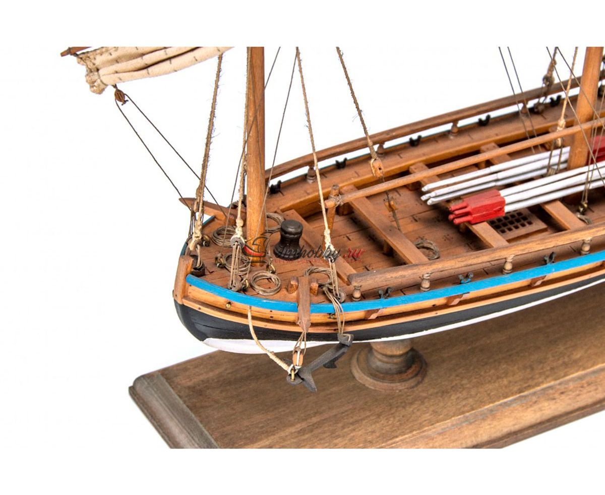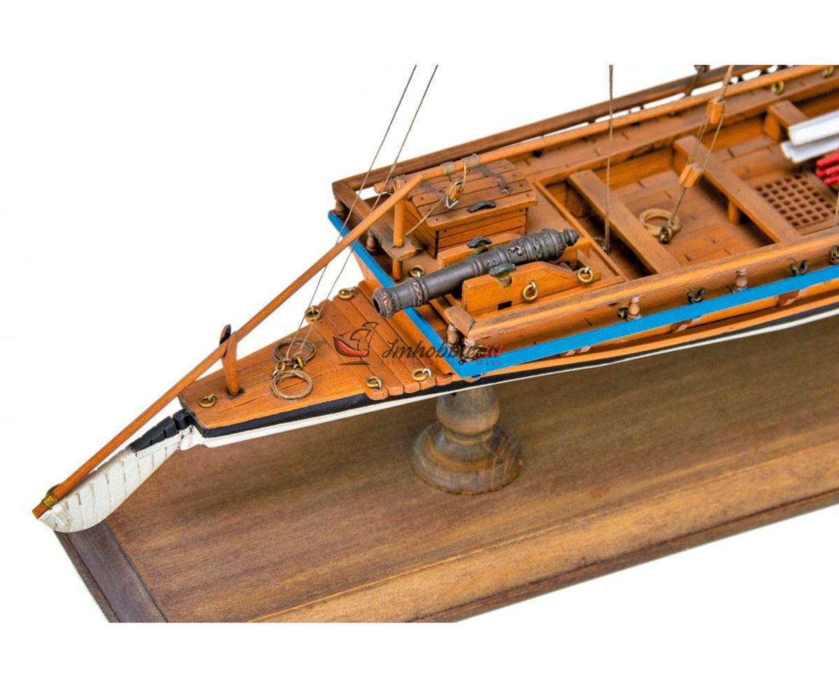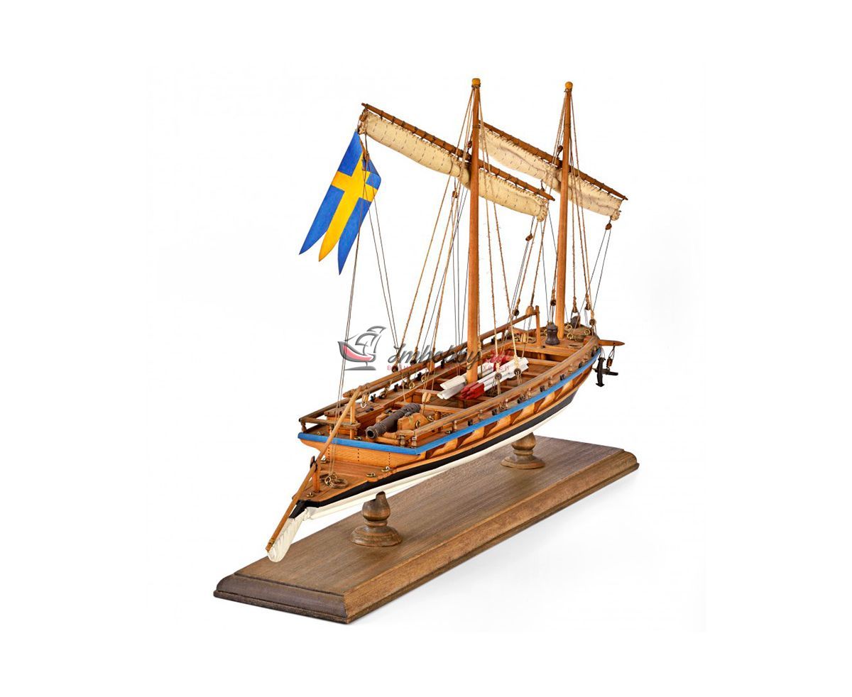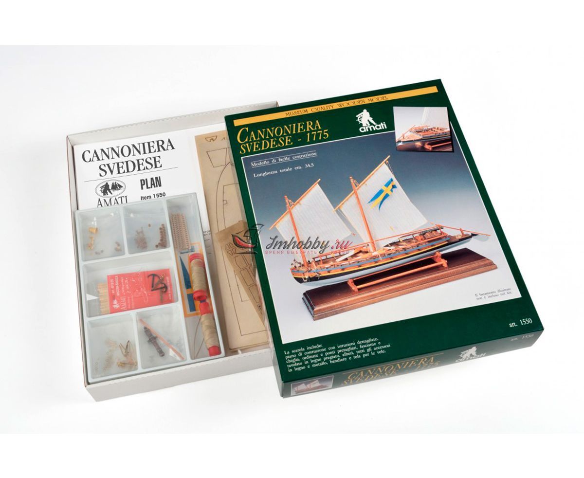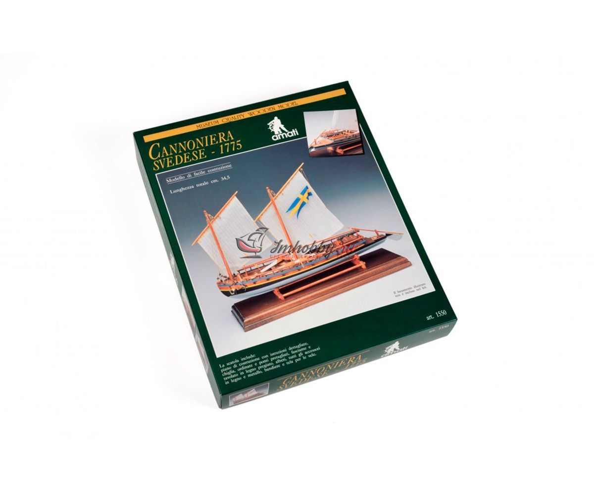 Фредерик Чапмен привел подобную канонерскую лодку как специально разработанную для ведения боевых действий во фьёрдах Скандинавии. Поэтому лодка получилось лёгкой и манёвренной. Отличительной чертой канонерки стала пушка на корме, смещенная к правому борту.Модель корабля Cannoniera Svedese 1775 от итальянской фирмы Amati привлекает внимание за счет яркой окраски, несложной сборки и высокому качеству используемых материалов.Корпус модели собирается из вырезанных лазером деталей и имеет одинарную обшивку из бука. В комплект входят металлические якоря, рымы, гвоздики, петли руля, 45 мм пушка, уключины для вёсел. Из дерева (орех, самшит, липа) даны блоки, юферсы, решётки, весла, шпиль и пиллерсы. Обшивку и детали рангоута предлагается выполнить из таких пород дерева как липа, бук и тёмный орех. Завершают модель нити для такелажа, паруса, которые предстоит выполнить самостоятельно из прилагаемой ткани . Набор содержит полномасштабный чертеж и лаконичную инструкцию по сборке (поэтому мы рекомендуем эту модель для тех, кто уже имеет опыт изготовления деревянных моделей кораблей). Подставка для модели собирается по схемам из отдельных деталей. Спецификации:Масштаб: 1:45Длина: 345 ммШирина: 70 ммВысота: 205 мм