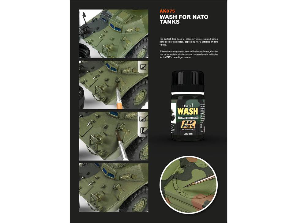 Идеальная темная смывка для современных автомобилей, окрашенных в темный трехцветный камуфляж, особенно для автомобилей НАТО или других темных камуфляжей. Нанесите смывку на вашу модель и удалите излишки чистой кистью, смоченной растворителем для эмали.