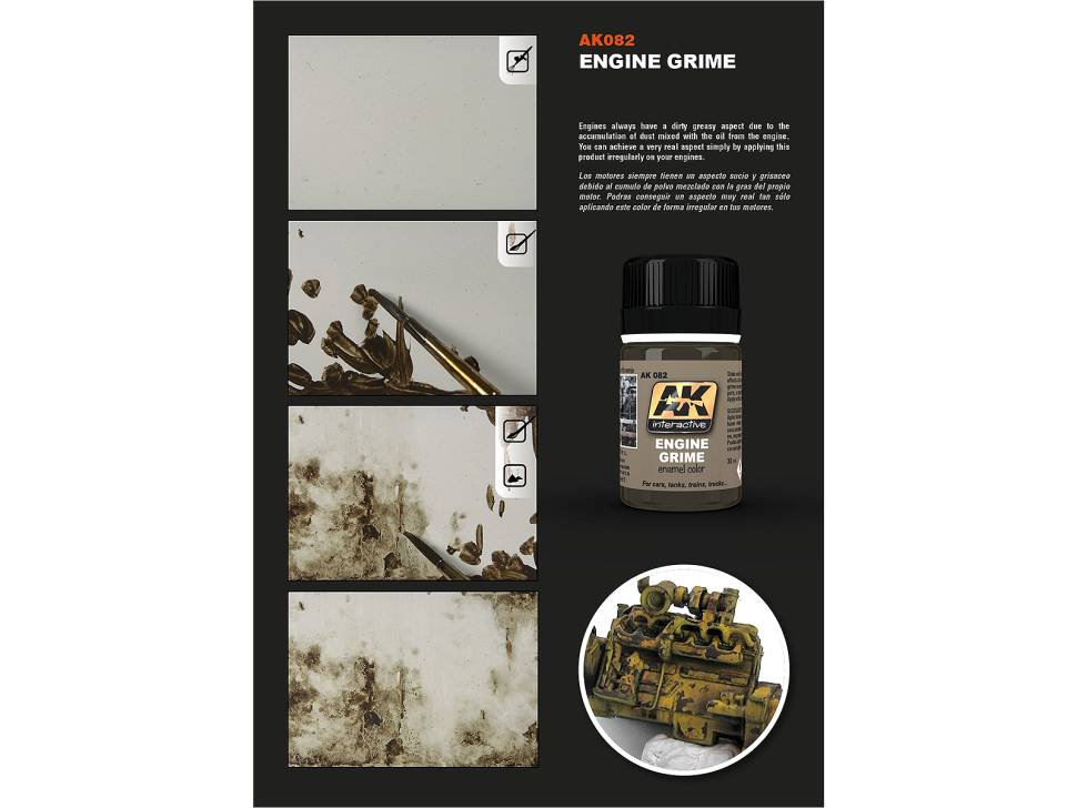 С помощью этой смеси получите сероватый, коричневый, темный, матовый цвет, который вы можете увидеть в двигателях, которые уже давно используются. Наносите кистью или аэрографом для получения разных результатов. После растушуйте кистью, смоченной растворителем для эмали.