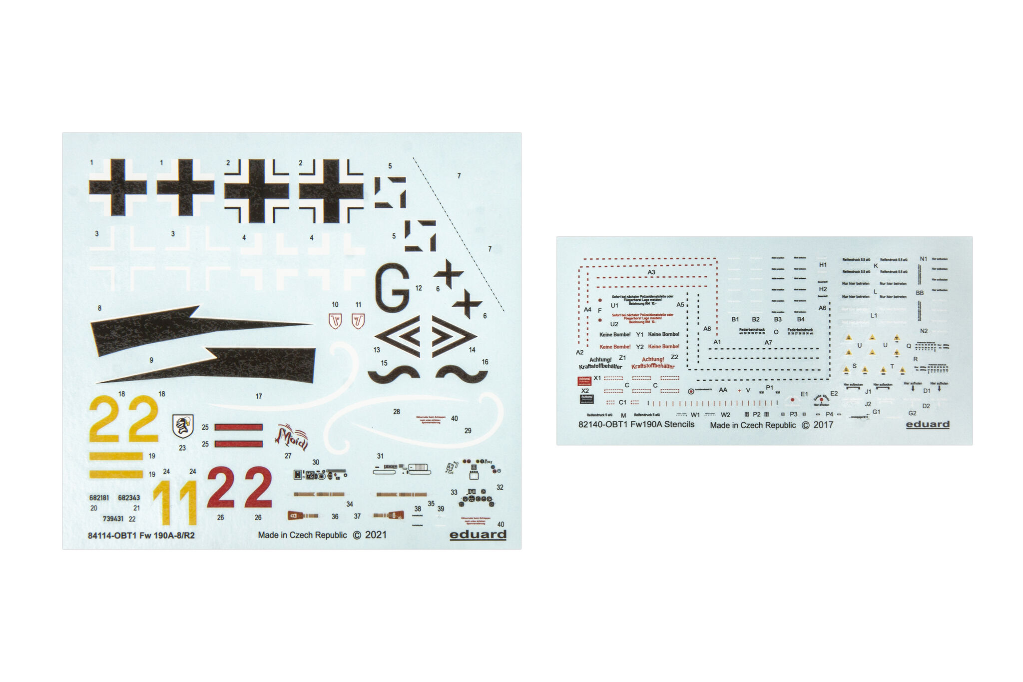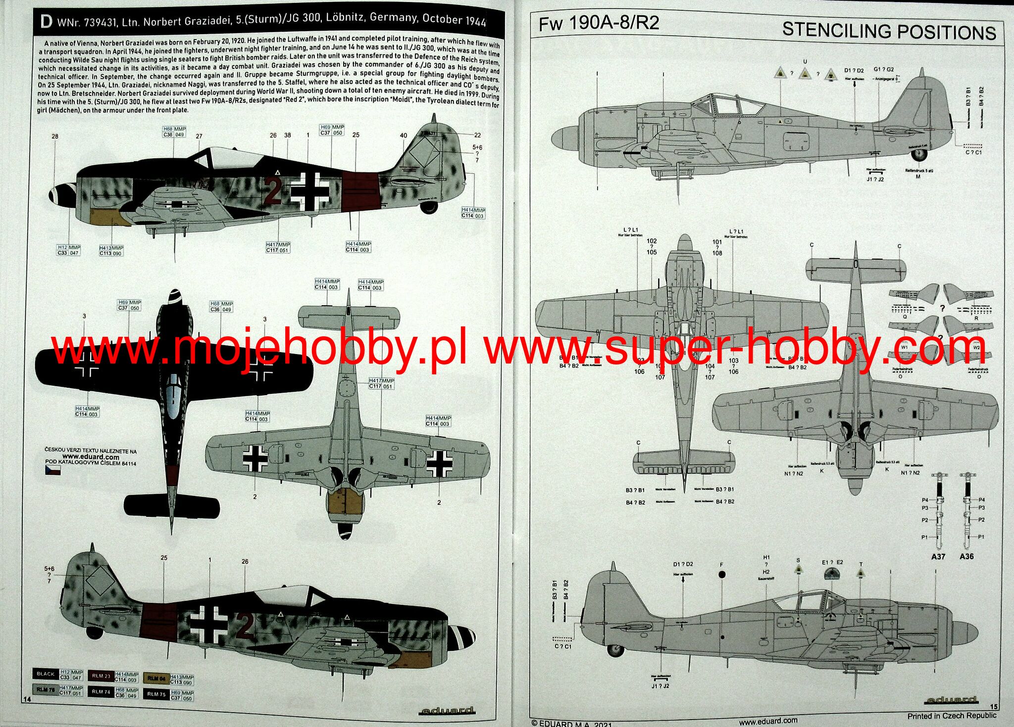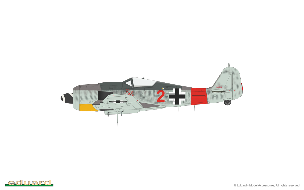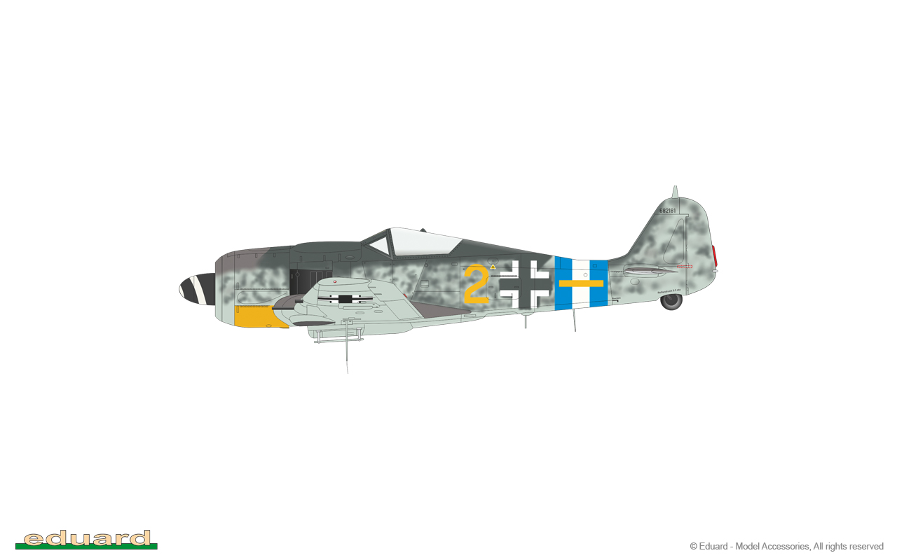 The Focke-Wulf Fw-190 is a German, single-engine, full-metal fighter aircraft with a covered cabin in the low wing design of the Second World War. The pilots considered the Fw-190 to be a better aircraft than the Messerschmitt Bf-109. A self-supporting low wing with a working Fw-190 coating was commissioned by the Luftfahrtministerium, assembled in the fall of 1937. Kurt Tank submitted two propulsion proposals - the first with a liquid-cooled Daimler-Benz DB 601 engine, and the second with the new BMW 139 radial engine. The latter was chosen, and the work started in the spring of 1938 was headed by Obering R. Blaser. The first prototype of the Fw-190V1 was ready in May 1939, and it was flown in Bremen on June 1, 1939 by Captain Hans Sander. The second prototype, the FW-190V2, armed with two MG131 and two MG17 machine guns - all 7.92 mm caliber, was flew in October 1939. To reduce aerodynamic drag, both were equipped with a tunnel air inlet in the propeller cap, but problems with overheating of the engine resulted in a return to the proven NACA shield design. Before the tests of these prototypes began for good, the decision was already made to replace the BMW 139 engine with a stronger, but longer and heavier BMW 801. It required many changes, strengthening the structure and moving the cabin back, which later became a source of problems with the center of gravity. The advantage was the removal of problems with exhaust gas permeation and overheating of the cabin interior due to its direct vicinity to the BMW 139 engine. The third and fourth prototypes were abandoned, and the Fw-190V5 with the new engine was completed at the beginning of 1940. Later, it received wings with a wingspan enlarged by one meter (from the original 9.5 m), which made it 10 km / h slower, but it increased the rate of climb and improved maneuverability. It was marked Fw-190V5g, and the variant with the shorter wing was Fw-190V5k. The first seven machines of the Fw-190A-0 information series had a short wing, the rest - a longer one. The first operational unit equipped with the Fw-190 - 6./JG 26 stationed at Le Bourget, declared its operational readiness in August 1941 and from the first meeting of the new fighter with the British Supermarine Spitfire, its advantage over them became apparent. During the war, a dozen or so versions of this great plane were created. The machines of the "A" version, along with a dozen or so modernizations, served as fighter planes. The versions marked "B" and "C" were only prototypes of high-altitude fighters intended for fighting strategic bombers, but they did not enter into serial production. The "D" variant, as the only one of the Fw-190s, was powered by the new 1750HP Jumo 213A engine and was the German response to the P-51 Mustang. The new engine extended the fuselage by several dozen centimeters. This variant also performed mainly hunting and high-altitude fighter tasks. Numerous variants of the "F" version were used as fighter-bombers as direct support of the battlefield. The "G" version played the same role as the "F" version, but had a greater range. During the entire war, over 20,000 copies of this one of the best fighters of World War II were produced. Technical data (version Fw-190A-8): length: 9m, wingspan: 10.51m, height: 3.95m, maximum speed: 656km / h, rate of climb: 15m / s, maximum range: 800km, maximum ceiling 11410m , armament: fixed-2 MG131 13mm machine guns and 4 MG151 20mm cannons (2 MG 151 / 20E cannons for the D-9 version). 3_edu84114_instruction_sheet.pdf