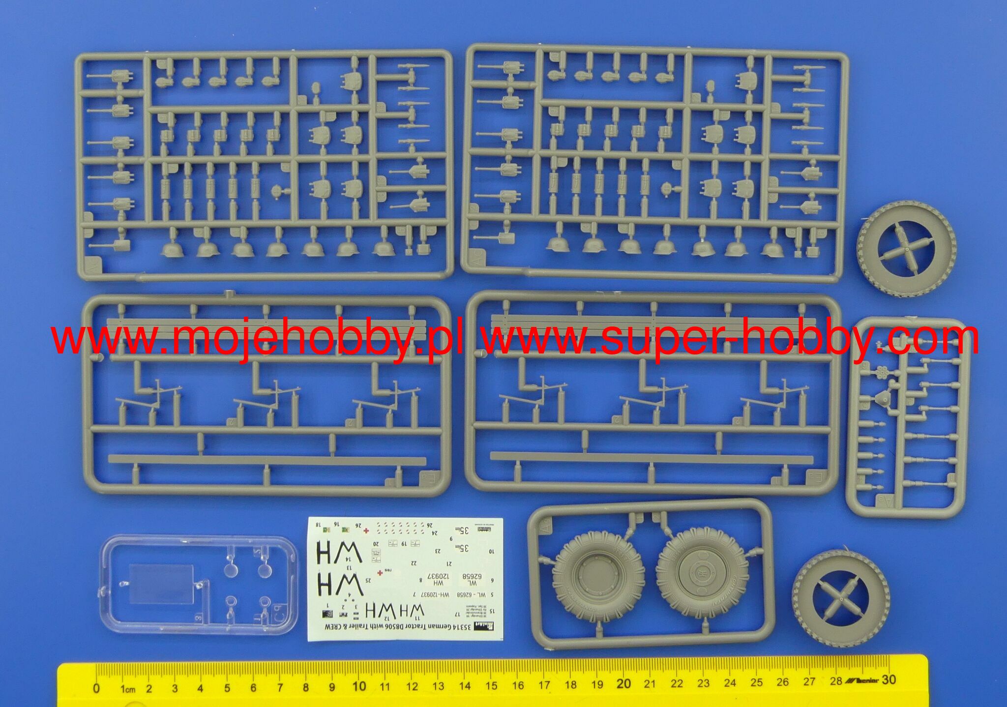 HIGHLY DETAILED MODEL KIT MODEL OF TRACTOR INCLUDED MODEL OF CARGO TRAILER INCLUDED 10 GERMAN SOLDIERS AND DRIVER FIGURES INCLUDED WEAPONS & EQUIPMENTS INCLUDED PHOTO-ETCHED PARTS INCLUDED CLEAR PLASTIC PARTS INCLUDED DECAL SHEET FOR 2 OPTIONS