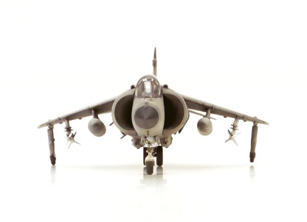 The British Aerospace Sea Harrier was a VTOL / STOVL (Short take-off and vertical landing) capable fighter, developed to equip the air arm sections of the British Royal Navy. It entered into service during the late ‘70s and early ‘80s with the main operational role of fleet air defence aircraft. In 1982 it was deployed on HMS Invincible and HMS Hermes during the Falklands war, fully demonstrating its operational effectiveness during the conflict. Unable to match the speed and flight characteristics of opposing aircraft such as the Mirage 111, it was nevertheless extremely manoeuvrable and reliable in all operating conditions. The Sea Harrier was equipped with an effective offensive armament capability, consisting of two 30mm ADEN guns installed in pods under the fuselage and by 4 sub-wing hardpoints to launch air-to-air missiles.