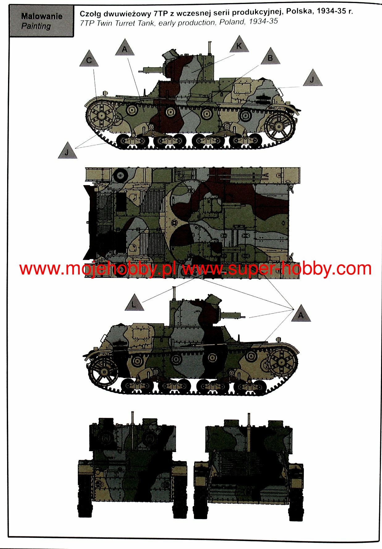 Polish light tank from the beginning of World War II. The 7TP tank, along with the tankettes (e.g. TKS), was the basic element of the Polish armored forces in 1939. 7 TP was designed at Państwowe Zakłady Inżynierii in Ursus, where it was also produced since 1935. The tank is a development of the British Vickers E, the license of which was acquired by Poland in the early 1930s. The first 24 examples of the 7TP were twin-turret vehicles, the next serial ones (built from 1937) already had one turret, and the main armament was the anti-tank gun. 37mm by Bofors. The 7TP tank was a technically advanced design for its time. It was one of the first in the world to have a diesel engine, a reversible periscope, and in some copies also radio stations (RKBc 2N / C) with a range of up to 25 km. During the September campaign, around 130 tanks of this type of all variants were used. The 7TP proved itself on the battlefields of September 1939 as an opponent towering over the German Pz.Kpfw I and II, and at least equal to the Pz.Kpfw III and IV. Technical data: weight 9.4-9.9t, engine power: 110HP, speed: 37km / h, armament (single turret version): 1 Bofors 37mm cannon, 1 machine gun wz. 30 cal. 7.92mm.