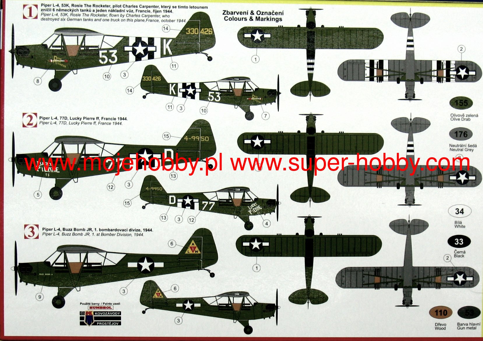 The Piper L4 (Piper Cub) is an American light transport and observation aircraft in the high wing configuration, with a mixed structure with a fixed landing gear and classic tail from the Second World War. The roots of the L4 go back to the civilian prototype called E-2, which first took to the air in September 1930, and which was mass-produced in the 1930s and received numerous development versions (including J-2, J-3 or J-5). In 1941, the J-3 version was adapted to the USAF's needs and designated the O-59, and eventually the L4. Several development versions were created, the first of which is the L4A, better adapted to the observation of the battlefield by increasing the cabin glazing. A lot of engines were used as the drive, including Continental A-65-8. The machine was widely used by the US Army in Europe as the basic liaison and battlefield observation aircraft. It was used both in North Africa and later in Italy and Normandy. The machine was nicknamed Grasshopper. About 20,000 were made of all versions of this plane! Specifications: length: 6.83m, wingspan: 10.74m, height: 2.03m, maximum speed: 140km / h, climb speed: 2.3m / s, practical ceiling: 3500m, maximum range: 354km.
